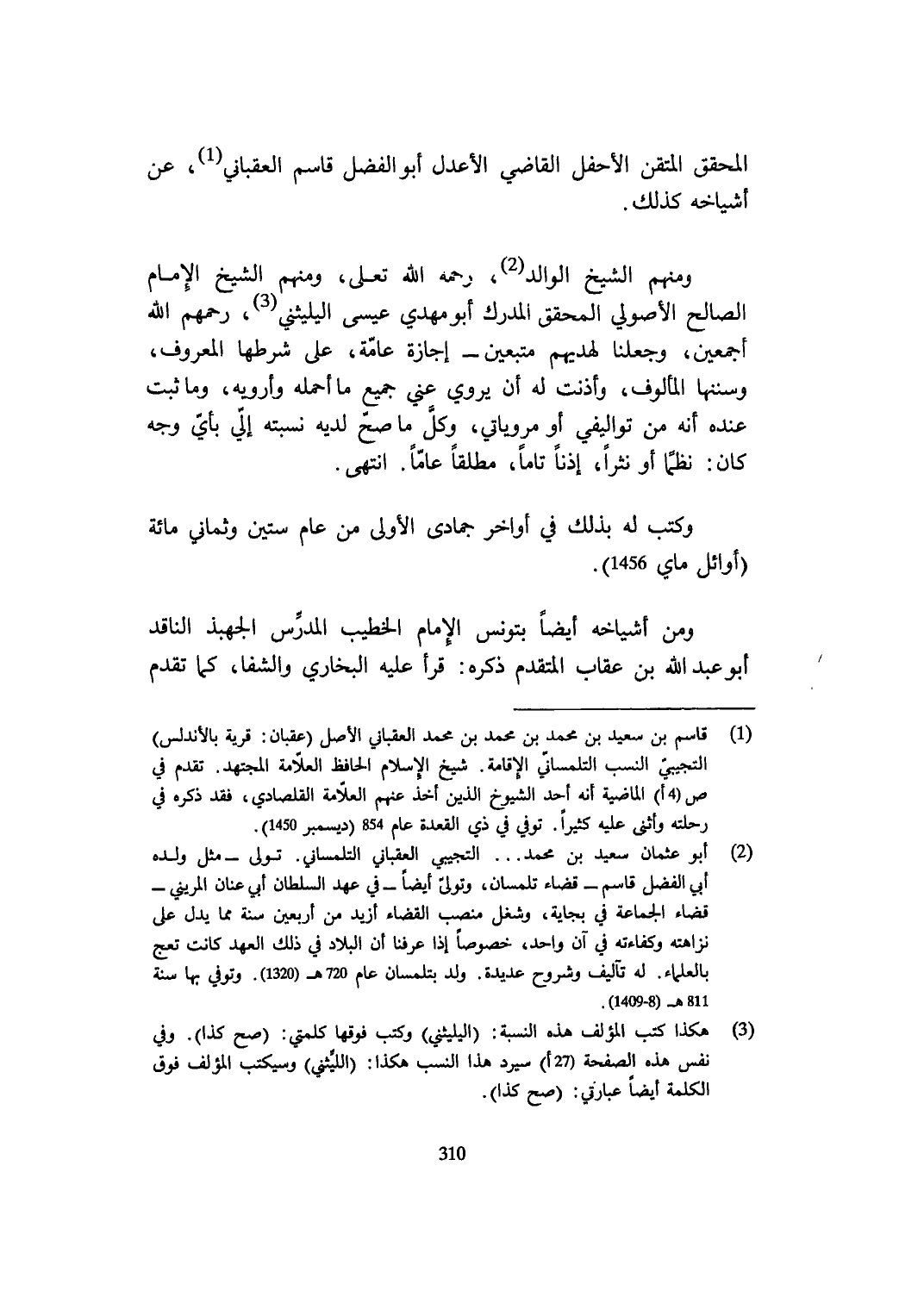 وَمِنْهُم الشَّيْخ الْوَالِد رَحمَه الله تعلى وَمِنْهُم الشَّيْخ الإِمَام الصَّالح الأصولي الْمُحَقق الْمدْرك أَبُو مهْدي عِيسَى اليليثني رَحِمهم الله أَجْمَعِينَ وَجَعَلنَا لهديهم متبعين إجَازَة عَامَّة على شَرطهَا الْمَعْرُوف وسننها المألوف وأذنت لَهُ أَن يروي عني جَمِيع مَا أحملهُ وأرويه وَمَا ثَبت عِنْده أَنه من تواليفي أَو مروياتي وكل مَا صَحَّ لَدَيْهِ نسبته إِلَى بِأَيّ وَجه كَانَ نظما أَو نثرا إِذْنا تَاما مُطلقًا عَاما انْتهى