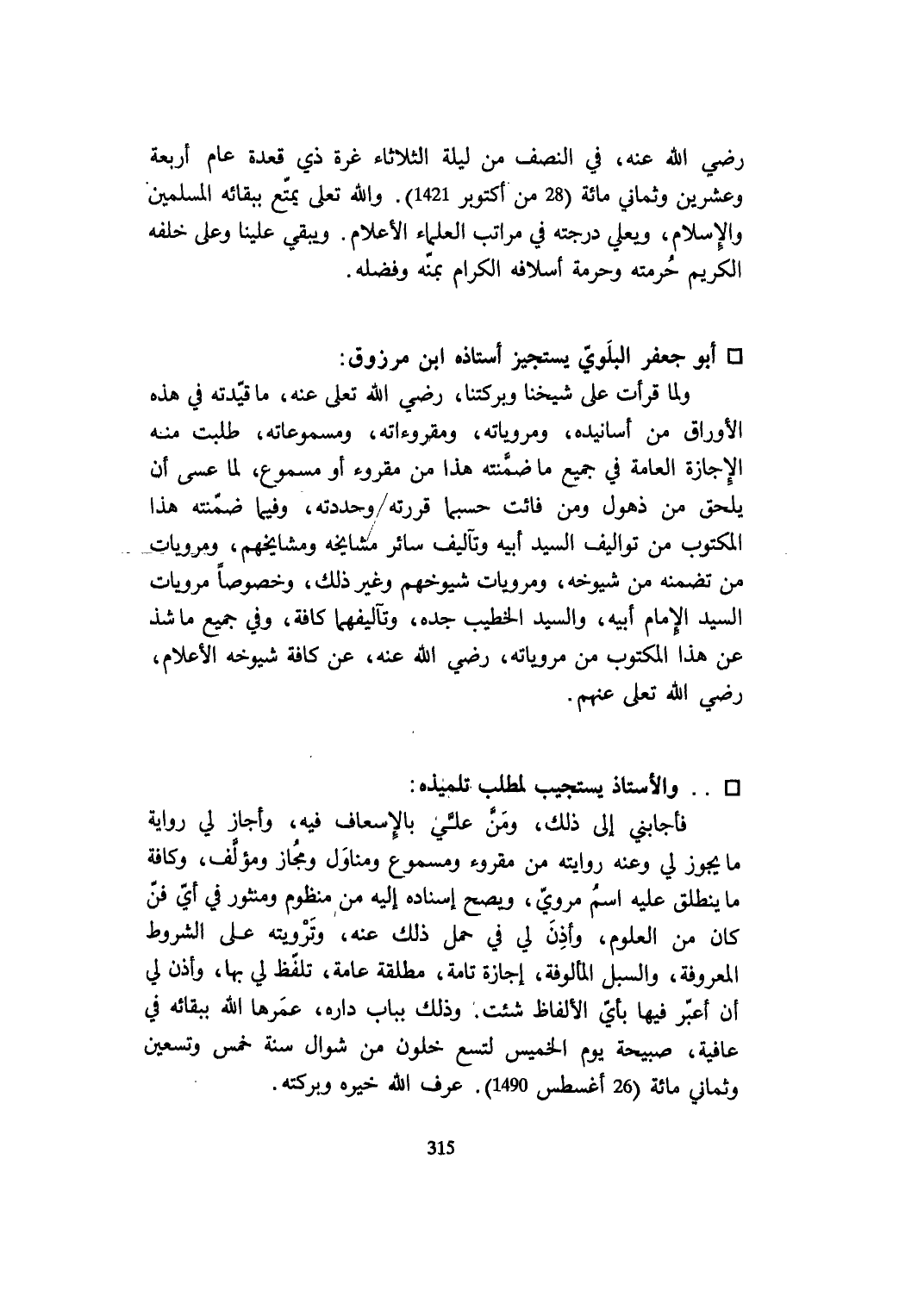 رَضِي الله عَنهُ فِي النّصْف من لَيْلَة الثُّلَاثَاء غرَّة ذِي قعدة عَام أَرْبَعَة وَعشْرين وثماني مائَة 28 من أكتوبر 1421 وَالله تعلى يمتع بِبَقَائِهِ الْمُسلمين وَالْإِسْلَام وَيعْلي دَرَجَته فِي مَرَاتِب الْعلمَاء الْأَعْلَام ويبقي علينا وعَلى خَلفه الْكَرِيم حرمته وَحُرْمَة أسلافه الْكِرَام بمنه وفضله