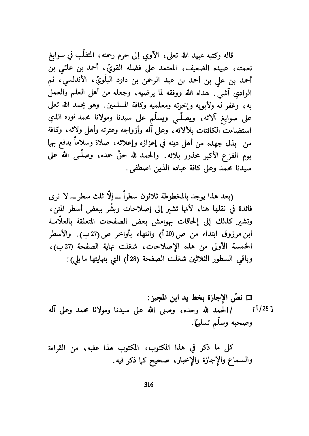 بعد هَذَا يُوجد بالمخطوطة ثَلَاثُونَ سطرا إِلَّا ثلث سطر لَا نرى فَائِدَة فِي نقلهَا هُنَا لِأَنَّهَا تُشِير إِلَى إصلاحات وَبشر بِبَعْض أسطر الْمَتْن وتشير كَذَلِك إِلَى إلحاقات بهوامش بعض الصفحات الْمُتَعَلّقَة بالعلامة ابْن مَرْزُوق ابْتِدَاء من ص 20 أوانتهاء بأواخر ص 27 ب والأسطر الْخَمْسَة الأولى من هَذِه الإصلاحات شغلت نِهَايَة الصفحة 27 ب وَبَاقِي السطور الثَّلَاثِينَ شغلت الصفحة 28 أالتي بنهايتها مَا يَلِي