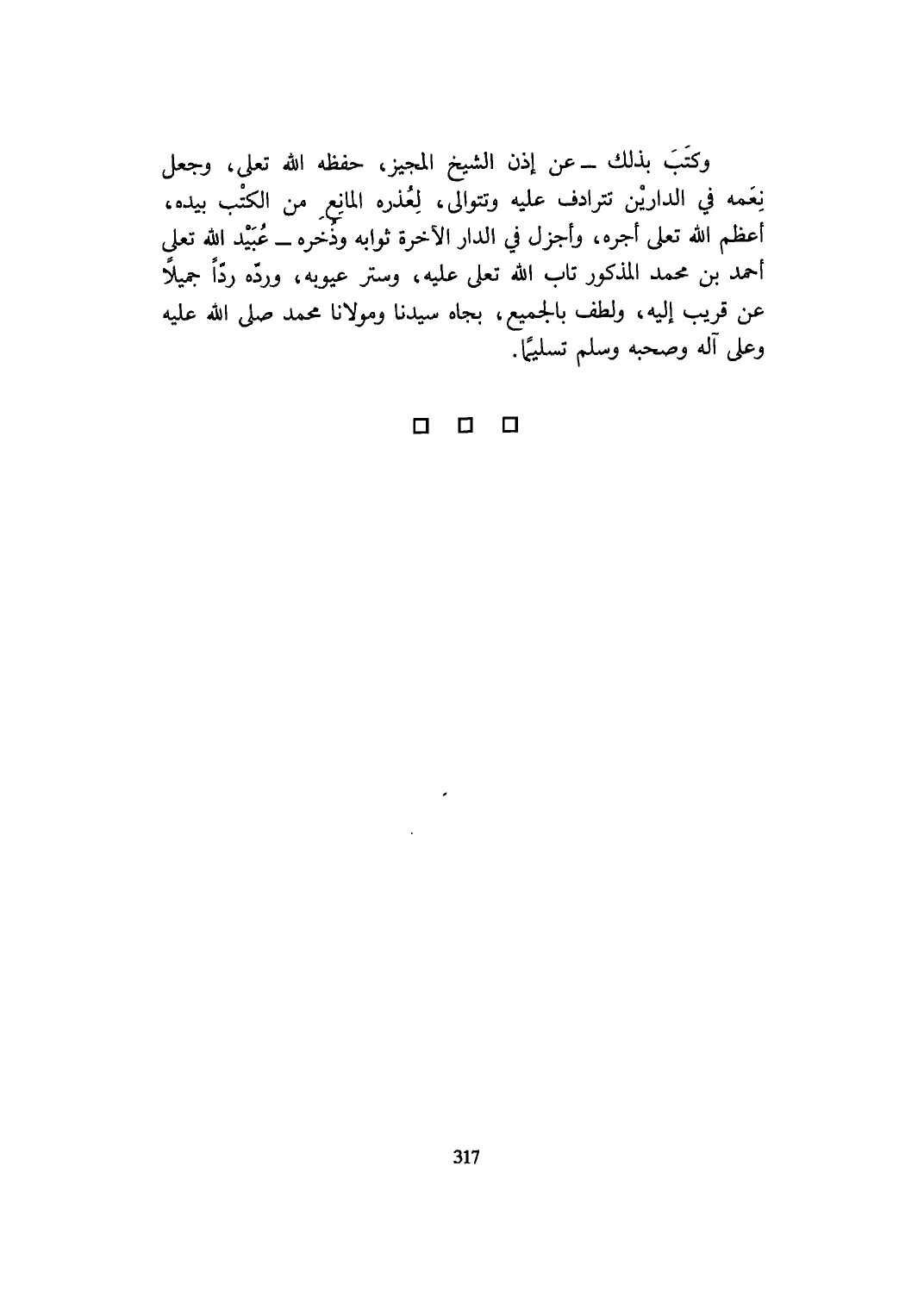 وَكتب بذلك عَن إِذن الشَّيْخ الْمُجِيز حفظه الله تعلى وَجعل نعمه فِي الدَّاريْنِ تترادف عَلَيْهِ وتتوالى لعذره الْمَانِع من الْكتب بِيَدِهِ أعظم الله تعلى أجره وأجزل فِي الدَّار الْآخِرَة ثَوَابه وذخره عبيد الله تعلى أَحْمد بن مُحَمَّد الْمَذْكُور تَابَ الله تعلى عَلَيْهِ وَستر عيوبه ورده ردا جميلا عَن قريب إِلَيْهِ ولطف بِالْجَمِيعِ بجاه سيدنَا ومولانا مُحَمَّد صلى الله عَلَيْهِ وَسلم وعَلى آله وَصَحبه وَسلم تَسْلِيمًا