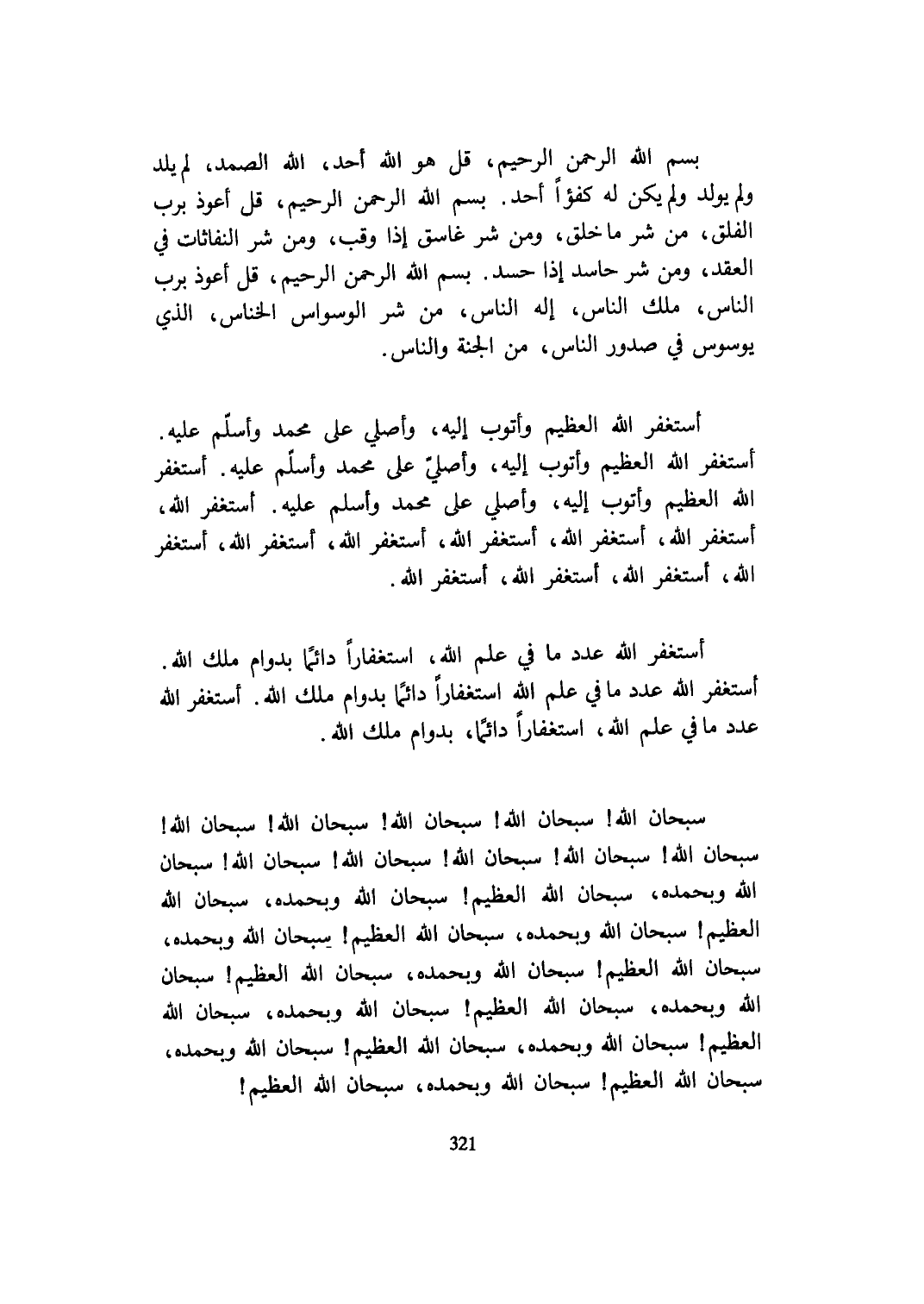 بِسم الله الرَّحْمَن الرَّحِيم قل هُوَ الله أحد الله الصَّمد لم يلد وَلم يُولد وَلم يكن لَهُ كُفؤًا أحد بِسم الله الرَّحْمَن الرَّحِيم {قل أعوذ بِرَبّ الفلق من شَرّ مَا خلق وَمن شَرّ غَاسِق إِذا وَقب وَمن شَرّ النفاثات فِي العقد وَمن شَرّ حَاسِد إِذا حسد} بِسم الله الرَّحْمَن الرَّحِيم قل {أعوذ بِرَبّ النَّاس ملك النَّاس إِلَه النَّاس من شَرّ الوسواس الخناس الَّذِي يوسوس فِي صُدُور النَّاس من الْجنَّة وَالنَّاس}