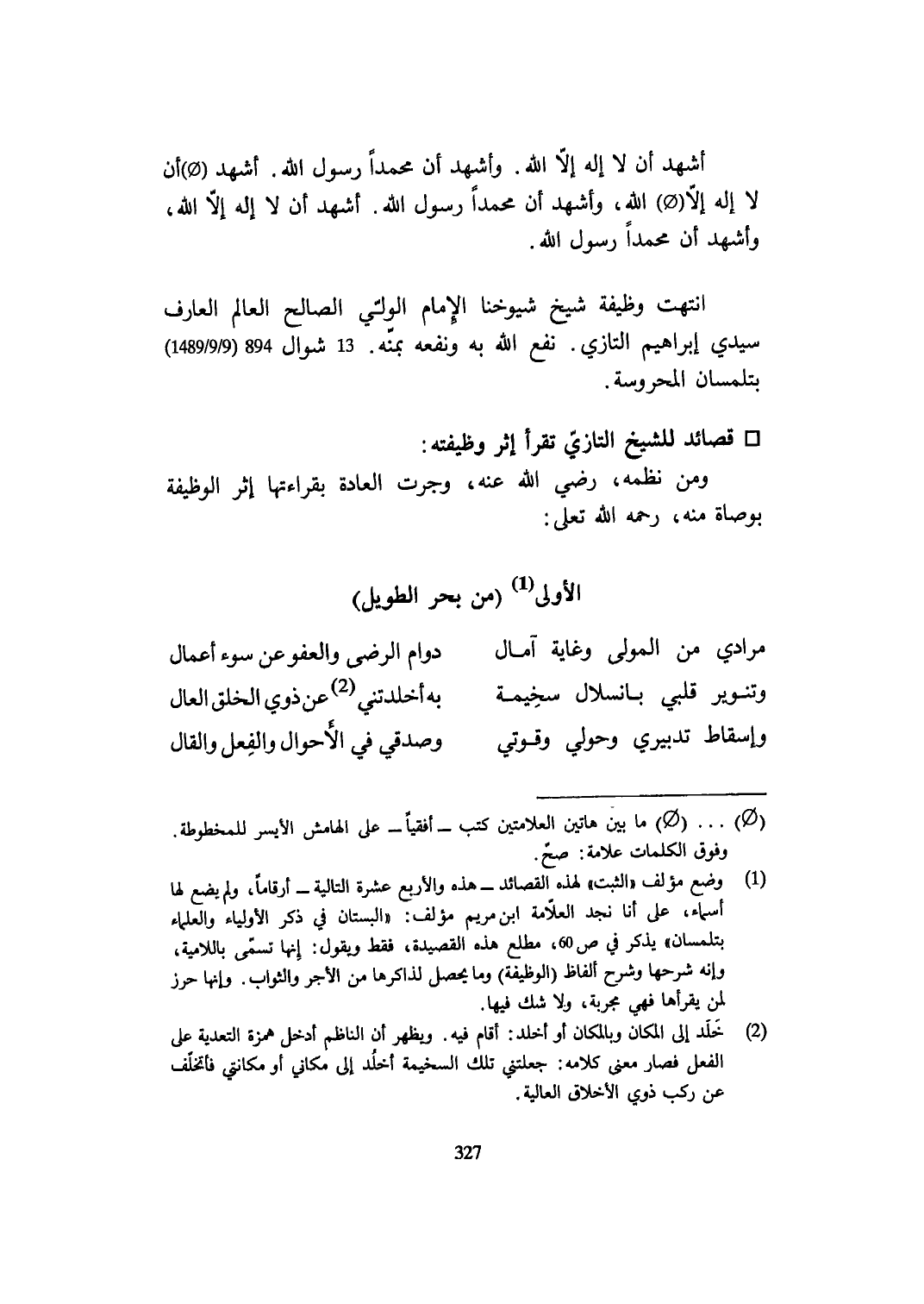 انْتَهَت وَظِيفَة شيخ شُيُوخنَا الإِمَام الْوَلِيّ الصَّالح الْعَالم الْعَارِف سَيِّدي إِبْرَاهِيم التازي نفع الله بِهِ ونفعه بمنه 13 شَوَّال 1489 / 894 / 9 / 9 بتلمسان المحروسة