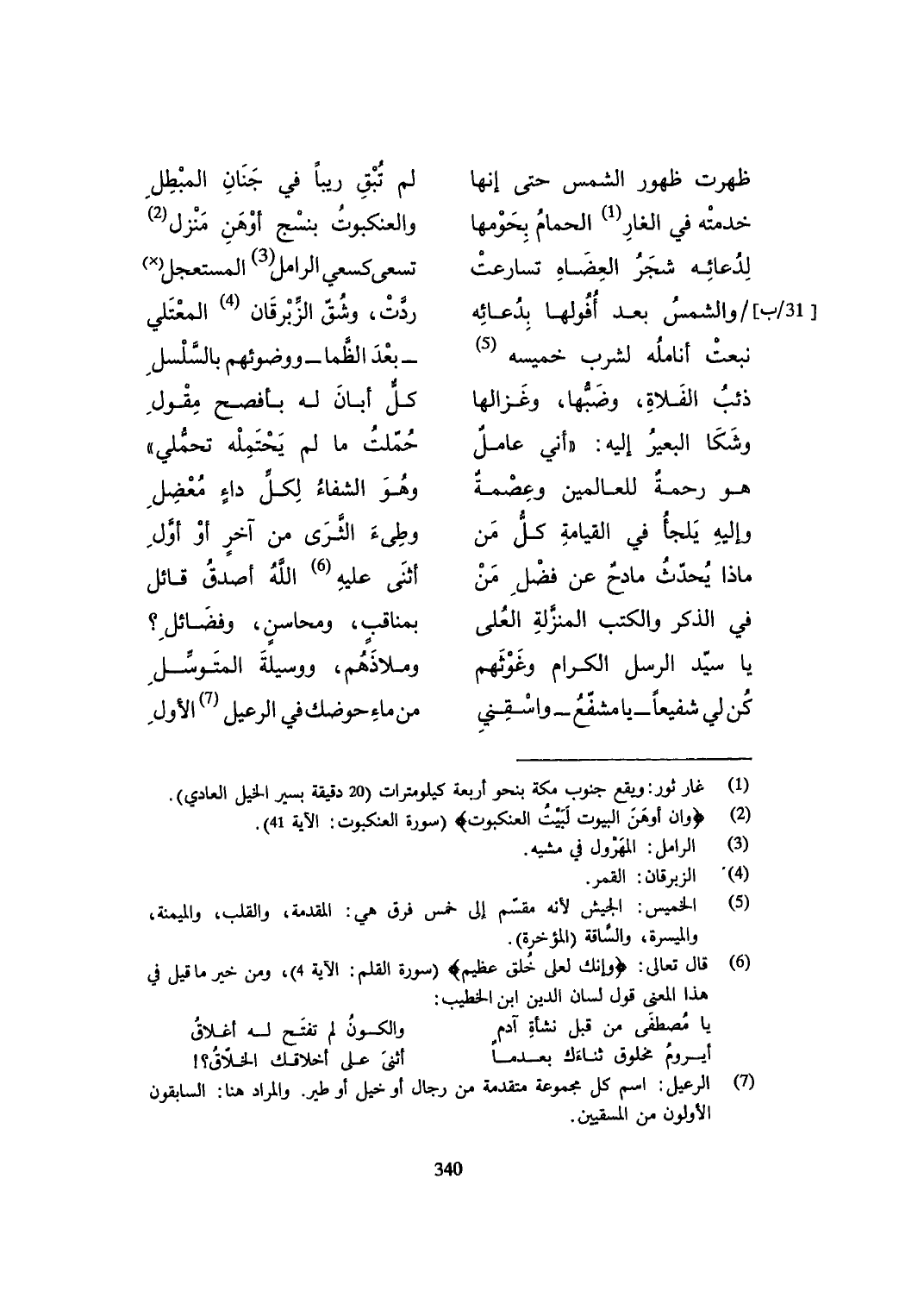 (وَالشَّمْس بعد أفوالها بدعائه ... ردَّتْ وشق الزبْرِقَان المعتلي)