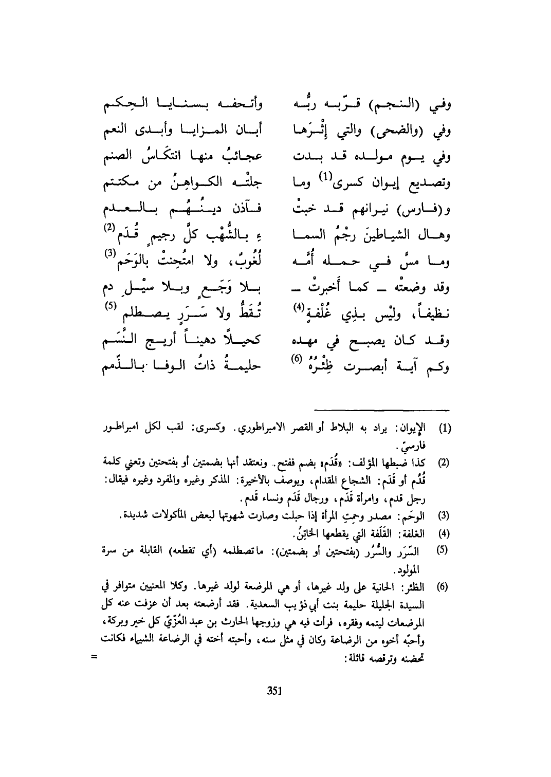 (وَكم آيَة أَبْصرت ظئره ... حليمة ذَات الوفا بالذمم)