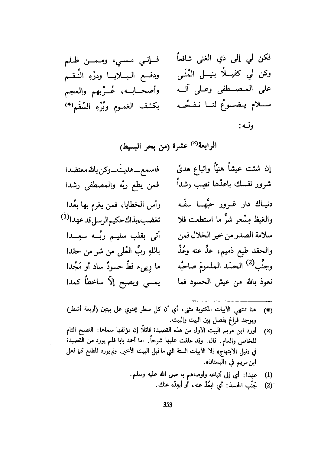 (إِن شِئْت عَيْشًا هنيا وَاتِّبَاع هدى ... فاسمع هديت وَكن بِاللَّه معتضدا)