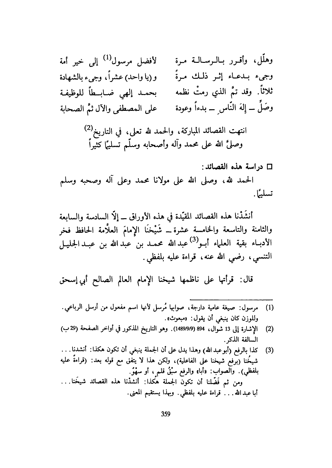 أنشدنا هَذِه القصائد الْمقيدَة فِي هَذِه الأوراق إِلَّا السَّادِسَة وَالسَّابِعَة وَالثَّامِنَة والتاسعة وَالْخَامِسَة عشرَة شَيخنَا الإِمَام الْعَلامَة الْحَافِظ فَخر الأدباء بَقِيَّة الْعلمَاء أَبُو عبد الله مُحَمَّد بن عبد الله بن عبد الْجَلِيل التنسي رَضِي الله عَنهُ قِرَاءَة عَلَيْهِ بلفظي