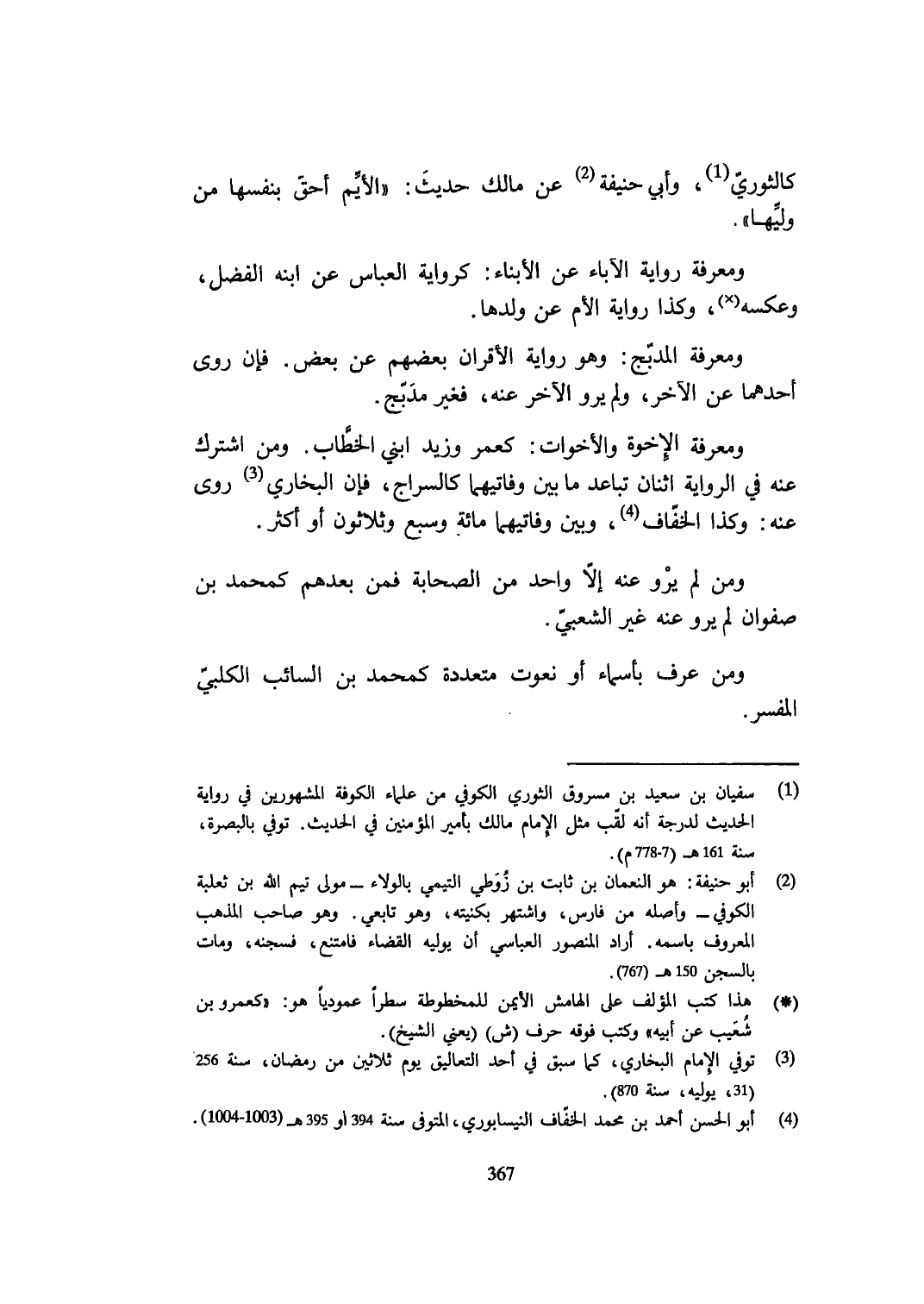 وَمَعْرِفَة رِوَايَة الْآبَاء عَن الْأَبْنَاء كَرِوَايَة الْعَبَّاس عَن ابْنه الْفضل وَعَكسه وَكَذَا رِوَايَة الْأُم عَن وَلَدهَا