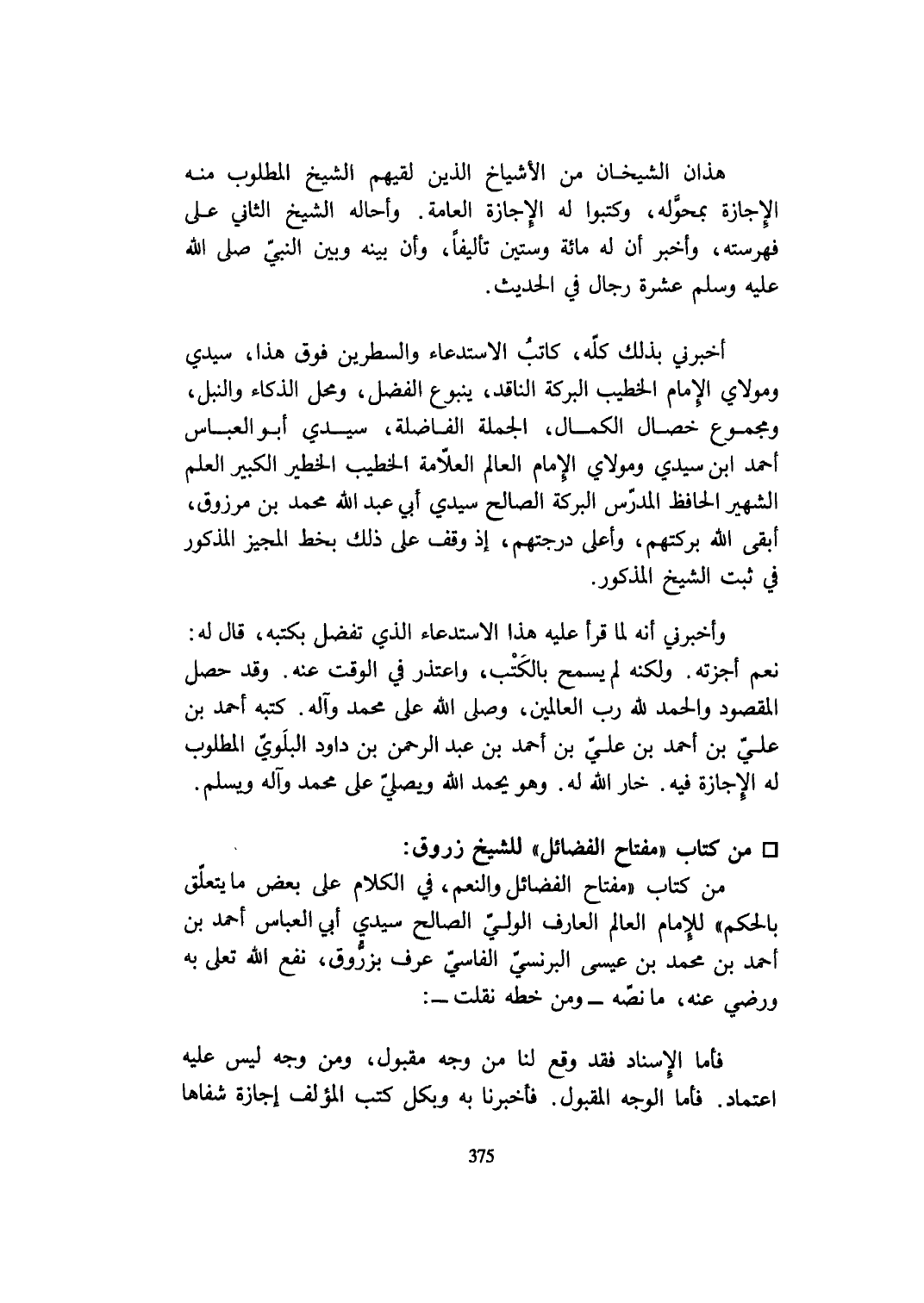 أَخْبرنِي بذلك كُله كَاتب الاستدعاء والسطرين فَوق هَذَا سَيِّدي ومولاي الإِمَام الْخَطِيب الْبركَة النَّاقِد ينبوع الْفضل وَمحل الذكاء والنبل ومجموع خِصَال الْكَمَال الْجُمْلَة الفاضلة سَيِّدي أَبُو الْعَبَّاس أَحْمد ابْن سَيِّدي ومولاي الإِمَام الْعَالم الْعَلامَة الْخَطِيب الخطير الْكَبِير الْعلم الشهير الْحَافِظ الْمدرس الْبركَة الصَّالح سَيِّدي أبي عبد الله مُحَمَّد بن مَرْزُوق أبقى الله بركتهم وَأَعْلَى درجتهم إِذْ وقف على ذَلِك بِخَط الْمُجِيز الْمَذْكُور فِي ثَبت الشَّيْخ الْمَذْكُور