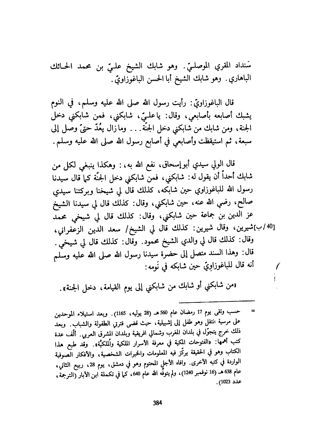 قَالَ الْوَلِيّ سَيِّدي أبوإسحاق نفع الله بِهِ وَهَكَذَا يَنْبَغِي لكل من شابك أحدا أَن يَقُول لَهُ شابكني فَمن شابكني دخل الْجنَّة كَمَا قَالَ سيدنَا رَسُول الله للباغوزاوي حِين شابكة كَذَلِك قَالَ لي شَيخنَا وبركتنا سَيِّدي صَالح رَضِي الله عَنهُ حِين شابكني وَقَالَ كَذَلِك قَالَ لي سيدنَا الشَّيْخ عز الدّين بن جمَاعَة حِين شابكني وَقَالَ كَذَلِك قَالَ لي شَيْخي مُحَمَّد شيرين وَقَالَ شيرين كَذَلِك قَالَ لي الشَّيْخ سعد الدّين الزَّعْفَرَانِي وَقَالَ كَذَلِك قَالَ لي وَالِدي الشَّيْخ مَحْمُود وَقَالَ كَذَلِك قَالَ لي شَيْخي قَالَ وَهَذَا السَّنَد مُتَّصِل إِلَى حَضْرَة سيدنَا رَسُول الله صلى الله عَلَيْهِ وَسلم أَنه قَالَ للباغوزاوي حِين شابكه فِي نَومه