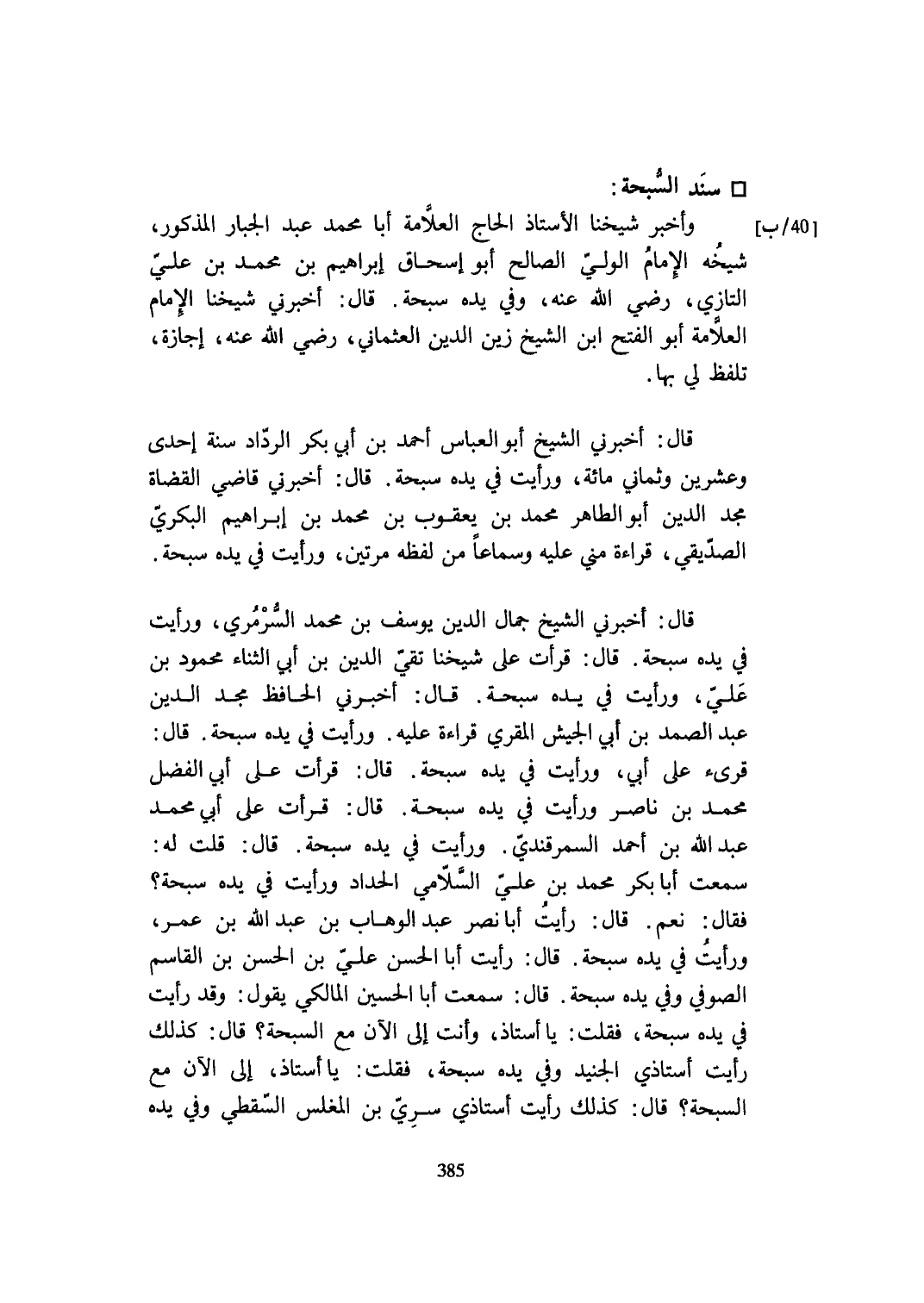 قَالَ أَخْبرنِي الشَّيْخ جمال الدّين يُوسُف بن مُحَمَّد السرمري وَرَأَيْت فِي يَده سبْحَة قَالَ قَرَأت على شَيخنَا تَقِيّ الدّين بن أبي الثَّنَاء مَحْمُود بن عَليّ وَرَأَيْت فِي يَده سبْحَة قَالَ أَخْبرنِي الْحَافِظ مجد الدّين عبد الصَّمد بن أبي الْجَيْش الْمقري قِرَاءَة عَلَيْهِ وَرَأَيْت فِي يَده سبْحَة قَالَ قرىء على أبي وَرَأَيْت فِي يَده سبْحَة قَالَ قَرَأت على أبي الْفضل مُحَمَّد بن نَاصِر وَرَأَيْت فِي يَده سبْحَة قَالَ قَرَأت على أبي مُحَمَّد عبد الله بن أَحْمد السَّمرقَنْدِي وَرَأَيْت فِي يَده سبْحَة قَالَ قلت لَهُ سَمِعت أَبَا بكر مُحَمَّد بن عَليّ السلَامِي الْحداد وَرَأَيْت فِي يَده سبْحَة فَقَالَ نعم قَالَ رَأَيْت أَبَا نصر عبد الْوَهَّاب بن عبد الله بن عمر وَرَأَيْت فِي يَده سبْحَة قَالَ رَأَيْت أَبَا الْحسن عَليّ بن الْحسن بن الْقَاسِم الصُّوفِي وَفِي يَده سبْحَة قَالَ سَمِعت أَبَا الْحُسَيْن الْمَالِكِي يَقُول وَقد رَأَيْت فِي يَده سبْحَة فَقلت يَا أستاذ وَأَنت إِلَى الْآن مَعَ السبحة قَالَ كَذَلِك رَأَيْت أستاذي الْجُنَيْد وَفِي يَده سبْحَة فَقلت يَا أستاذ إِلَى الْآن مَعَ السبحة قَالَ كَذَلِك رَأَيْت أستاذي سري بن الْمُغلس السَّقطِي وَفِي يَده