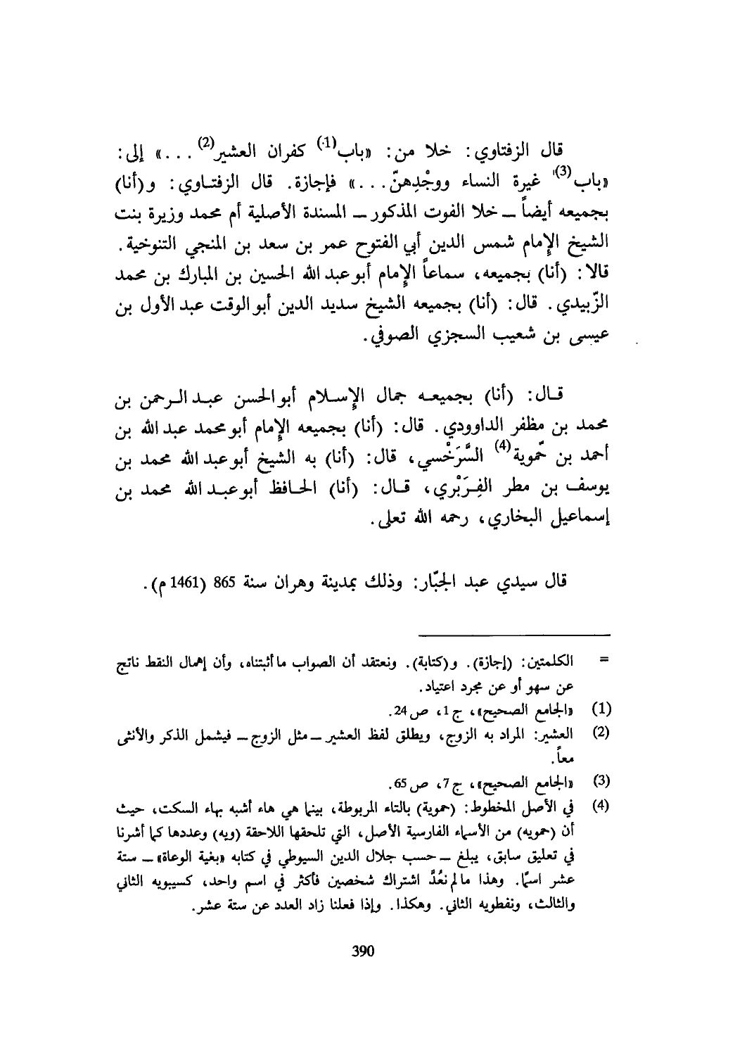قَالَ الزفتاوي خلا من بَاب كفران العشير إِلَى بَاب غيرَة النِّسَاء ووجدهن فإجازة قَالَ الزفتاوي وَأَنا بِجَمِيعِهِ أَيْضا خلا الْفَوْت الْمَذْكُور المسندة الْأَصْلِيَّة أم مُحَمَّد وزيرة بنت الشَّيْخ الإِمَام شمس الدّين أبي الْفتُوح عمر بن سعد بن المنجي التنوخية قَالَا أَنا بِجَمِيعِهِ سَمَاعا الإِمَام أَبُو عبد الله الْحُسَيْن بن الْمُبَارك بن مُحَمَّد الزبيدِيّ قَالَ أَنا بِجَمِيعِهِ الشَّيْخ سديد الدّين أَبُو الْوَقْت عبد الأول بن عِيسَى بن شُعَيْب السجْزِي الصُّوفِي