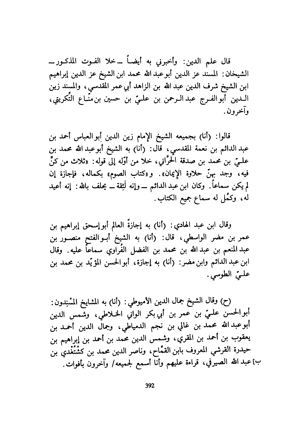 قَالَ علم الدّين وَأَخْبرنِي بِهِ أَيْضا خلا الْفَوْت الْمَذْكُور الشَّيْخَانِ الْمسند عز الدّين أَبُو عبد الله مُحَمَّد ابْن الشَّيْخ عز الدّين إِبْرَاهِيم ابْن الشَّيْخ شرف الدّين عبد الله بن الزَّاهِد أبي عمر الْمَقْدِسِي والمسند زين الدّين أَبُو الْفرج عبد الرَّحْمَن بن عَليّ بن حُسَيْن بن مناع التكريتي وَآخَرُونَ