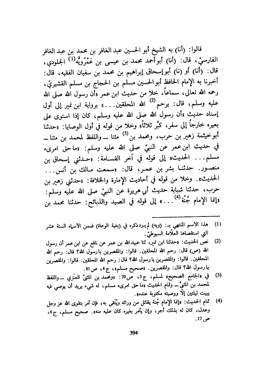 قَالُوا أَنا بِهِ الشَّيْخ أَبُو الْحُسَيْن عبد الْغفار بن مُحَمَّد بن عبد الغافر الْفَارِسِي قَالَ أَنا أَبُو أَحْمد مُحَمَّد بن عِيسَى بن عمرويه الجلودي قَالَ أَنا أَو نَا أَبُو إِسْحَاق إِبْرَاهِيم بن مُحَمَّد بن سُفْيَان الْفَقِيه قَالَ أخبرنَا بِهِ الإِمَام الْحَافِظ أَبُو الْحُسَيْن مُسلم بن الْحجَّاج بن مُسلم الْقشيرِي رَحمَه الله تَعَالَى سَمَاعا خلا من حَدِيث ابْن عمر أَن رَسُول الله صلى الله عَلَيْهِ وَسلم قَالَ يرحم الله المحلقين بِرِوَايَة ابْن نمير إِلَى أول إِسْنَاد حَدِيث أَن رَسُول الله صلى الله عَلَيْهِ وَسلم كَانَ إِذا اسْتَوَى على بعيره خَارِجا إِلَى سفر كبر ثَلَاثًا وخلا من قَوْله فِي أول الْوَصَايَا حَدثنَا أَبُو خَيْثَمَة زُهَيْر بن حَرْب وَمُحَمّد بن مثنا وَاللَّفْظ لمُحَمد بن مثنا فِي حَدِيث ابْن عمر عَن النَّبِي صلى الله عَلَيْهِ وَسلم مَا حق امرىء مُسلم ... الحَدِيث إِلَى قَوْله فِي آخر الْقسَامَة حَدثنِي إِسْحَاق بن مَنْصُور حَدثنَا بشر بن عمر قَالَ سَمِعت مَالك بن أنس ... الحَدِيث وخلا من قَوْله فِي أَحَادِيث الْإِمَارَة والخلافة حَدثنِي زُهَيْر بن حَرْب حَدثنَا شَبابَة حَدِيث أبي هُرَيْرَة عَن النَّبِي صلى الله عَلَيْهِ وَسلم إِنَّمَا الإِمَام جنَّة إِلَى قَوْله فِي الصَّيْد والذبائح حَدثنَا مُحَمَّد بن