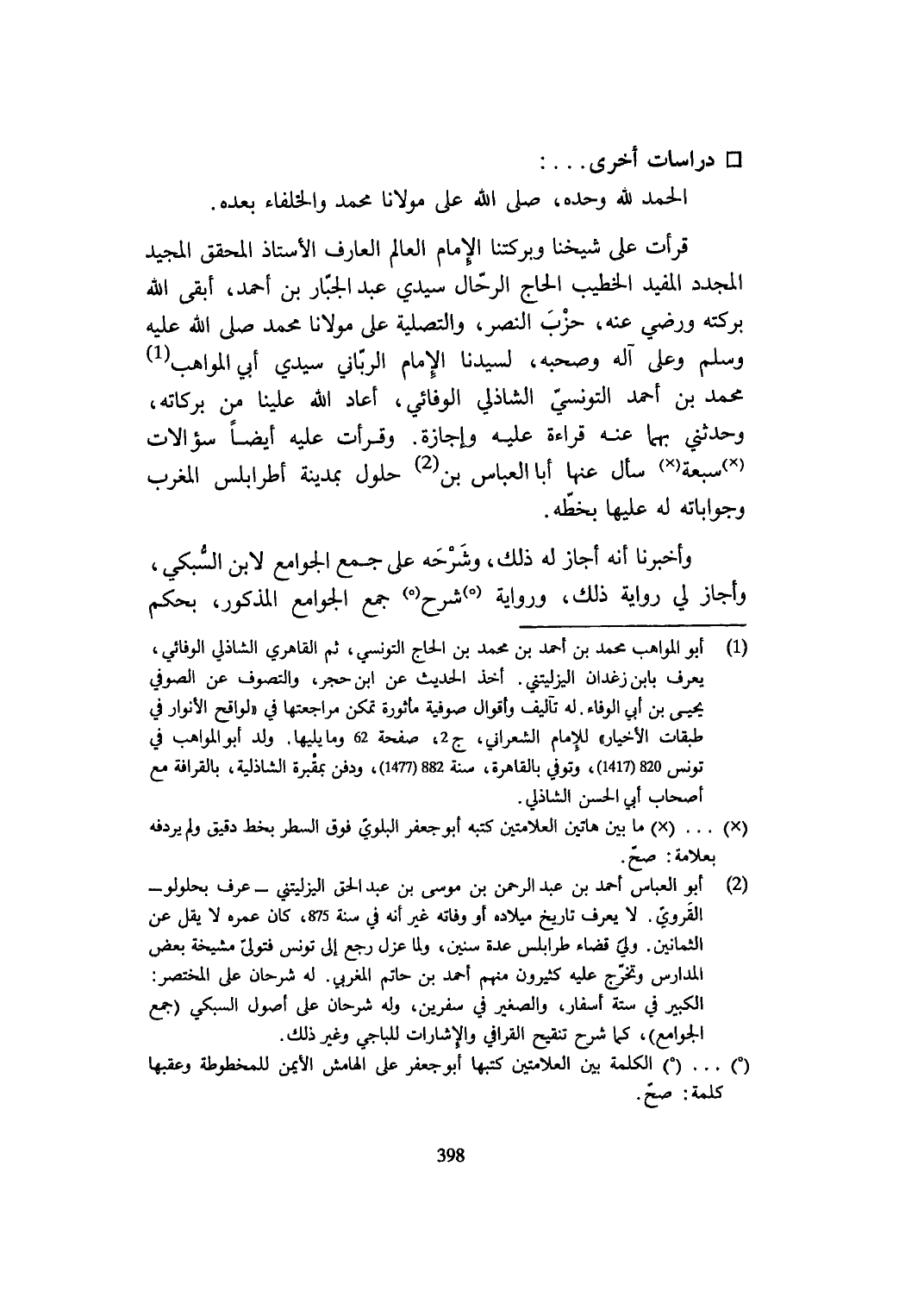 قَرَأت على شَيخنَا وبركتنا الإِمَام الْعَالم الْعَارِف الْأُسْتَاذ الْمُحَقق الْمجِيد المجدد الْمُفِيد الْخَطِيب الْحَاج الرّحال سَيِّدي عبد الْجَبَّار بن أَحْمد أبقى الله بركته وَرَضي عَنهُ حزب النَّصْر والتصلية على مَوْلَانَا مُحَمَّد صلى الله عَلَيْهِ وَسلم وعَلى آله وَصَحبه لسيدنا الإِمَام الرباني سَيِّدي أبي الْمَوَاهِب مُحَمَّد بن أَحْمد التّونسِيّ الشاذلي الوفائي أعَاد الله علينا من بركاته وحَدثني بهما عَنهُ قِرَاءَة عَلَيْهِ وإجازة وقرأت عَلَيْهِ أَيْضا سُؤَالَات سَبْعَة سَأَلَ عَنْهَا أَبَا الْعَبَّاس بن حُلُول بِمَدِينَة أطرابلس الْمغرب وجواباته لَهُ عَلَيْهَا بِخَطِّهِ