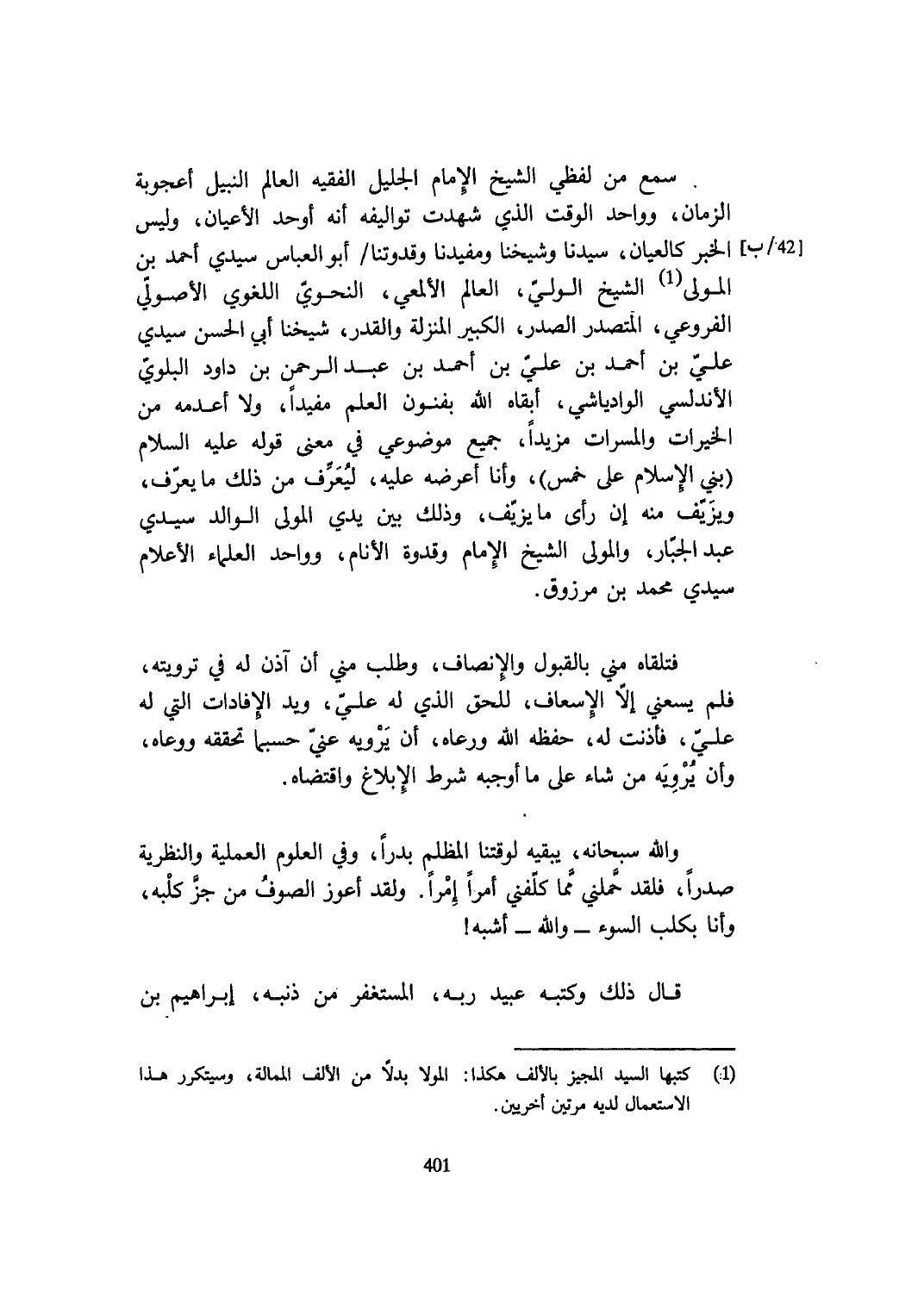 سمع من لَفْظِي الشَّيْخ الإِمَام الْجَلِيل الْفَقِيه الْعَالم النَّبِيل أعجوبة الزَّمَان وَوَاحِد الْوَقْت الَّذِي شهِدت تواليفه أَنه أوحد الْأَعْيَان وَلَيْسَ الْخَبَر كالعيان سيدنَا وَشَيخنَا ومفيدنا وقدوتنا أَبُو الْعَبَّاس سَيِّدي أَحْمد بن الْمولى الشَّيْخ الْوَلِيّ الْعَالم الألمعي النَّحْوِيّ اللّغَوِيّ الأصولي الفروعي المتصدر الصَّدْر الْكَبِير الْمنزلَة وَالْقدر شَيخنَا أبي الْحسن سَيِّدي عَليّ بن أَحْمد بن عَليّ بن أَحْمد بن عبد الرَّحْمَن بن دَاوُد البلوي الأندلسي الوادياشي أبقاه الله بفنون الْعلم مُفِيدا وَلَا أعدمه من الْخيرَات والمسرات مزيدا جَمِيع موضوعي فِي معنى قَوْله عَلَيْهِ السَّلَام بني الْإِسْلَام على خمس وَأَنا أعرضه عَلَيْهِ ليعرف من ذَلِك مايعرف ويزيف مِنْهُ إِن رأى مَا يزيف وَذَلِكَ بَين يَدي الْمولى الْوَالِد سَيِّدي عبد الْجَبَّار وَالْمولى الشَّيْخ الإِمَام وقدوة الْأَنَام وَوَاحِد الْعلمَاء الْأَعْلَام سَيِّدي مُحَمَّد بن مَرْزُوق
