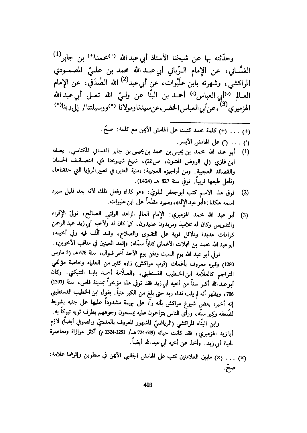 وحدثته بهَا عَن شَيخنَا الْأُسْتَاذ أبي عبد الله مُحَمَّد بن جَابر الغساني عَن الإِمَام الرباني أبي عبد الله مُحَمَّد بن عَليّ المصمودي المراكشي وشهرته بِابْن عليوات عَن أبي عبد الله الصَّدَفِي عَن الإِمَام الْعَالم أبي الْعَبَّاس أَحْمد بن الْبَنَّا عَن ولي الله تعلى أبي عبد الله الهزميري عَن أبي الْعَبَّاس الْخضر عَن سيدنَا ومولانا ووسيلتنا إِلَى رَبنَا