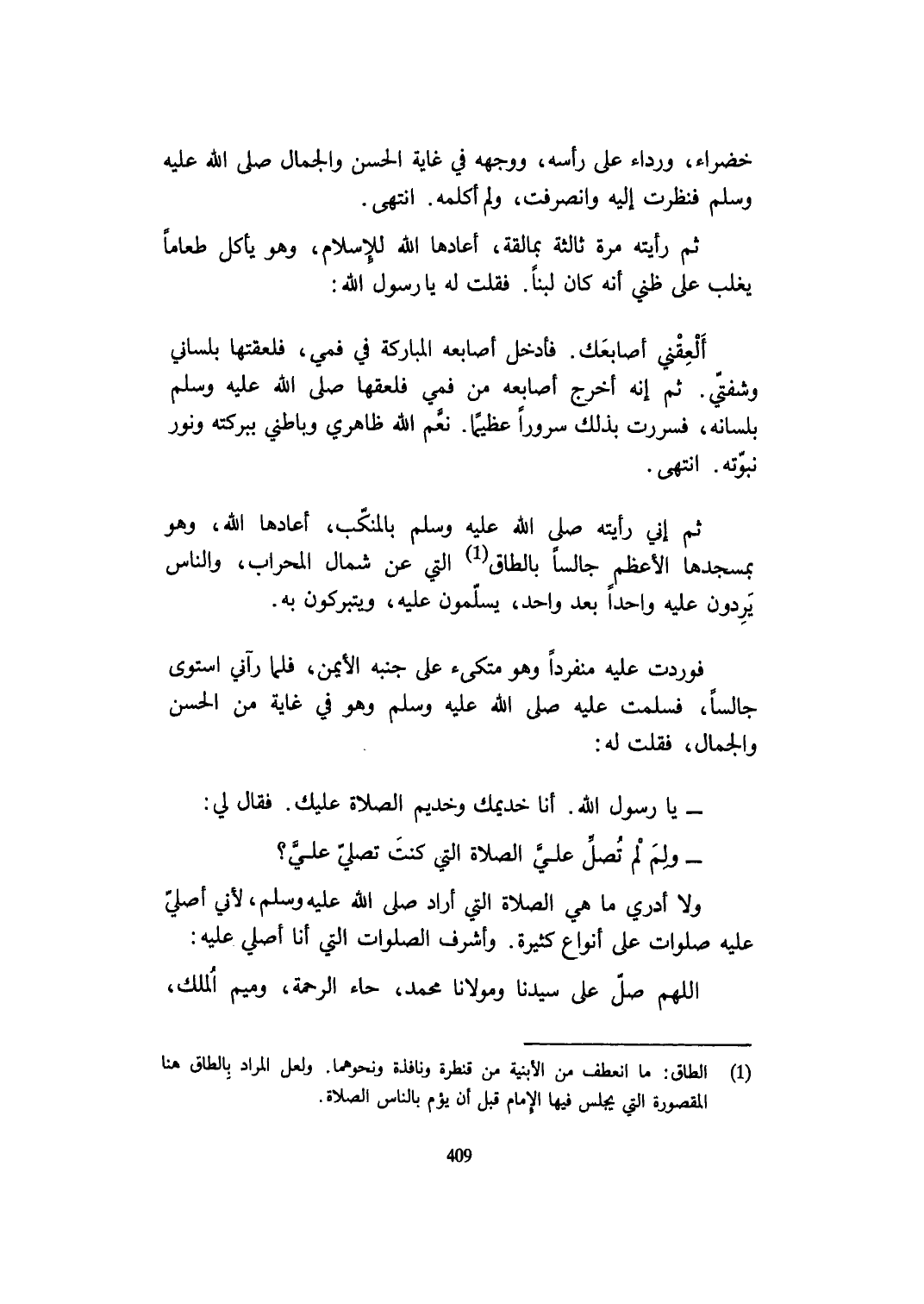 فوردت عَلَيْهِ مُنْفَردا وَهُوَ متكىء على جنبه الْأَيْمن فَلَمَّا رَآنِي اسْتَوَى جَالِسا فَسلمت عَلَيْهِ صلى الله عَلَيْهِ وَسلم وَهُوَ فِي غَايَة من الْحسن وَالْجمال فَقلت لَهُ