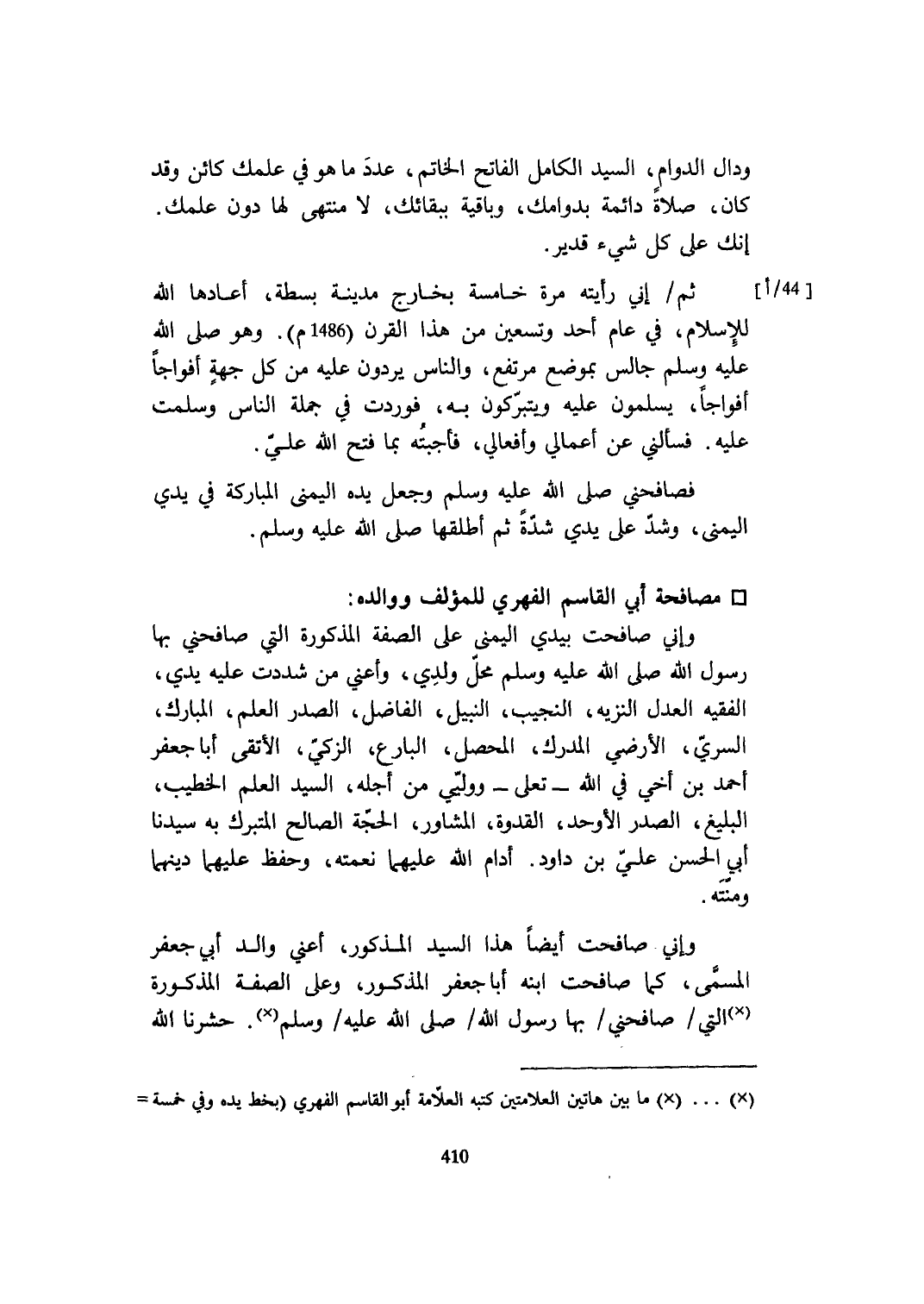 وَإِنِّي صافحت أَيْضا هَذَا السَّيِّد الْمَذْكُور أَعنِي وَالِد أبي جَعْفَر الْمُسَمّى كَمَا صافحت ابْنه أَبَا جَعْفَر الْمَذْكُور وعَلى الصّفة الْمَذْكُورَة الَّتِي صَافَحَنِي بهَا رَسُول الله صلى الله عَلَيْهِ وَسلم حشرنا الله