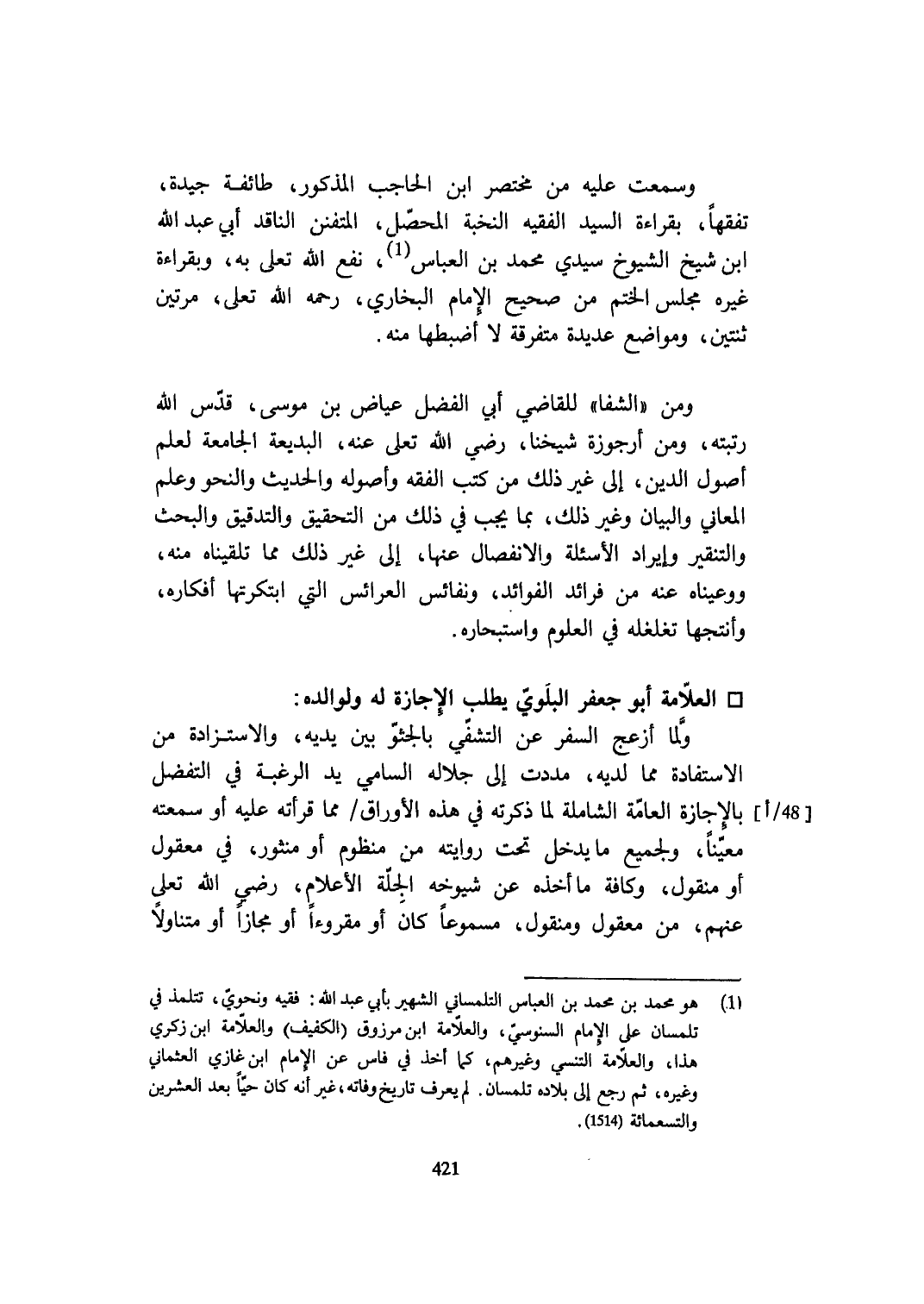 وَسمعت عَلَيْهِ من مُخْتَصر ابْن الْحَاجِب الْمَذْكُور طَائِفَة جَيِّدَة تفقها بِقِرَاءَة السَّيِّد الْفَقِيه النخبة المحصل المتفنن النَّاقِد أبي عبد الله ابْن شيخ الشُّيُوخ سَيِّدي مُحَمَّد بن الْعَبَّاس نفع الله تعلى بِهِ وبقراءة غَيره مجْلِس الْخَتْم من صَحِيح الإِمَام البُخَارِيّ رَحمَه الله تعلى مرَّتَيْنِ ثِنْتَيْنِ ومواضع عديدة مُتَفَرِّقَة لَا أضبطها مِنْهُ