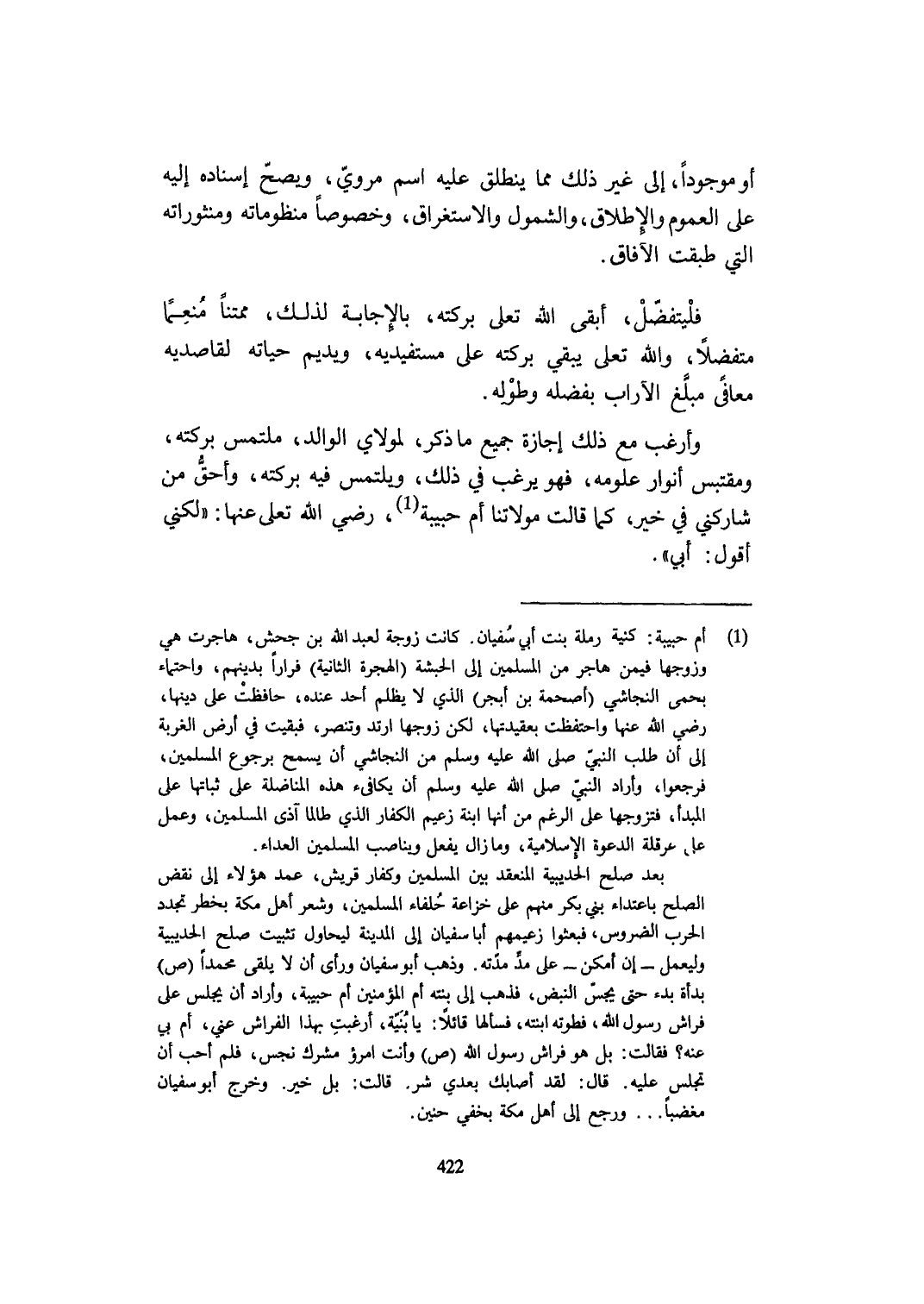 وأرغب مَعَ ذَلِك إجَازَة جَمِيع مَا ذكر لمولاي الْوَالِد ملتمس بركته ومقتبس أنوار علومه فَهُوَ يرغب فِي ذَلِك ويلتمس فِيهِ بركته وأحق من شاركني فِي خير كَمَا قَالَت مولاتنا أم حَبِيبَة رَضِي الله تعلى عَنْهَا لكني أَقُول أبي