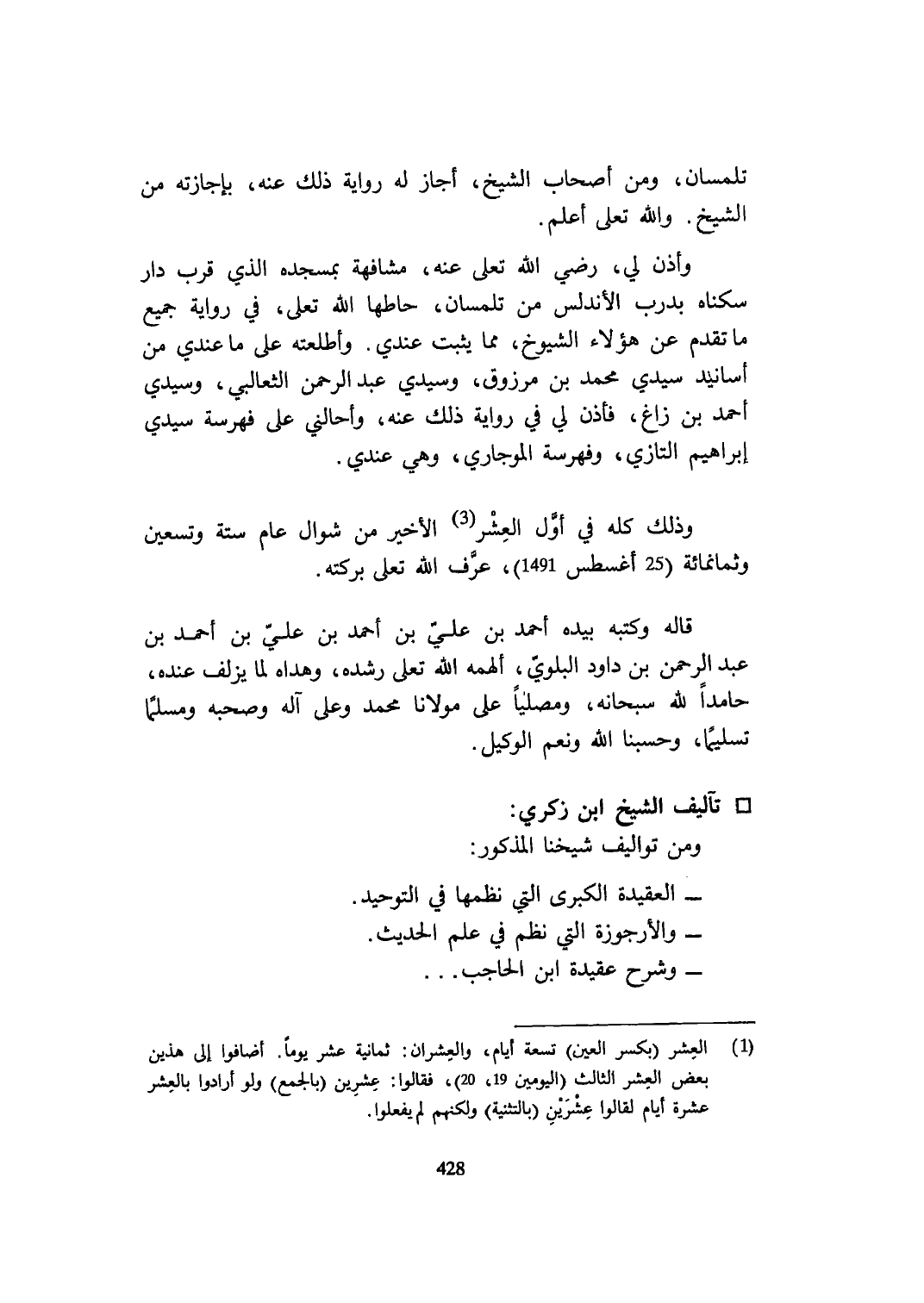 وَأذن لي رَضِي الله تعلى عَنهُ مشافهة بمسجده الَّذِي قرب دَار سكناهُ بدرب الأندلس من تلمسان حاطها الله تعلى فِي رِوَايَة جَمِيع مَا تقدم عَن هَؤُلَاءِ الشُّيُوخ مِمَّا يثبت عِنْدِي وأطلعته على مَا عِنْدِي من أَسَانِيد سَيِّدي مُحَمَّد بن مَرْزُوق وسيدي عبد الرَّحْمَن الثعالبي وسيدي أَحْمد بن زاغ فَأذن لي فِي رِوَايَة ذَلِك عَنهُ وأحالني على فهرسة سَيِّدي إِبْرَاهِيم التازي وفهرسة الموجاري وَهِي عِنْدِي