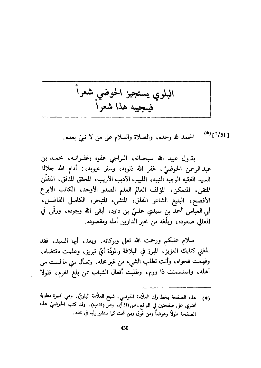 يَقُول عبيد الله سُبْحَانَهُ الراجي عَفوه وغفرانه مُحَمَّد بن عبد الرَّحْمَن الحوضي غفر الله ذنُوبه وَستر عيوبه أدام الله جلالة السَّيِّد الْفَقِيه الْوَجِيه النبيه اللبيب الأديب الأريب الْمُحَقق المدقق المتفنن المتقن المتمكن الْمُؤلف الْعَالم الْعلم الصَّدْر الأوحد الْكَاتِب الأبرع الْأَفْصَح البليغ الشَّاعِر المفلق المنشىء المتبحر الْكَامِل الْفَاضِل أبي الْعَبَّاس أَحْمد بن سَيِّدي عَليّ بن دَاوُد أبقى الله وجوده ورقى فِي الْمَعَالِي صُعُوده وبلغه من خير الدَّاريْنِ أمله ومقصوده