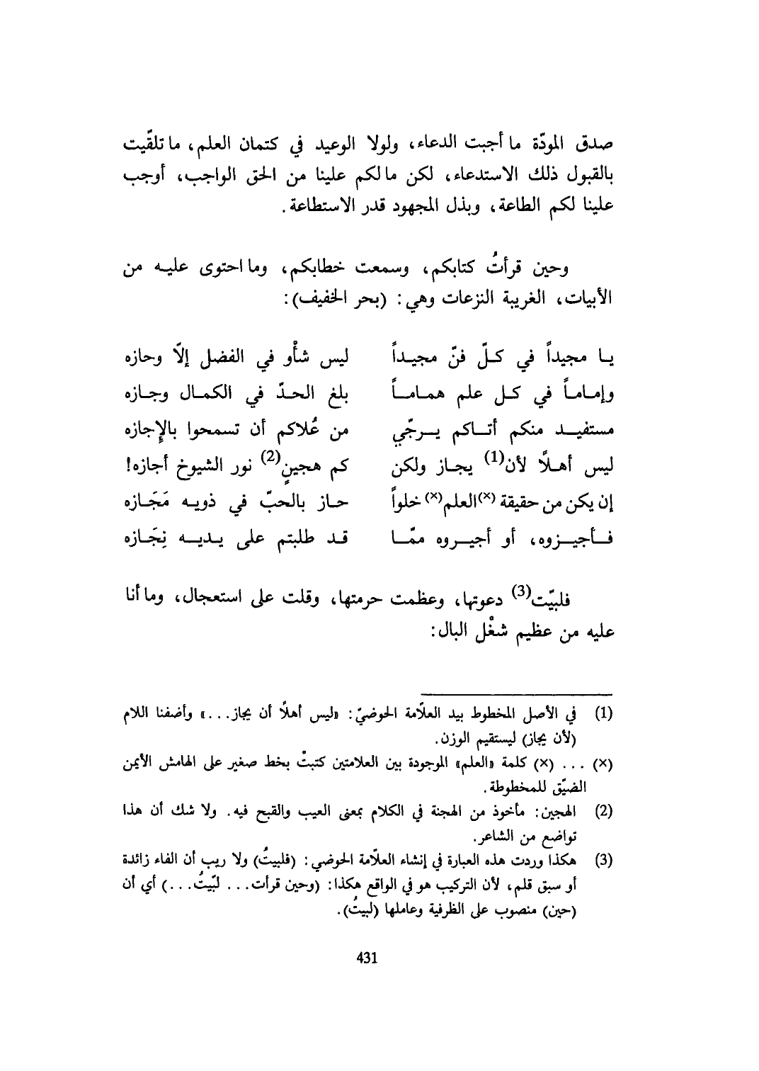 وَحين قَرَأت كتابكُمْ وَسمعت خطابكم وَمَا احتوى عَلَيْهِ من الأبيات الغريبة النزعات وَهِي بَحر الْخَفِيف