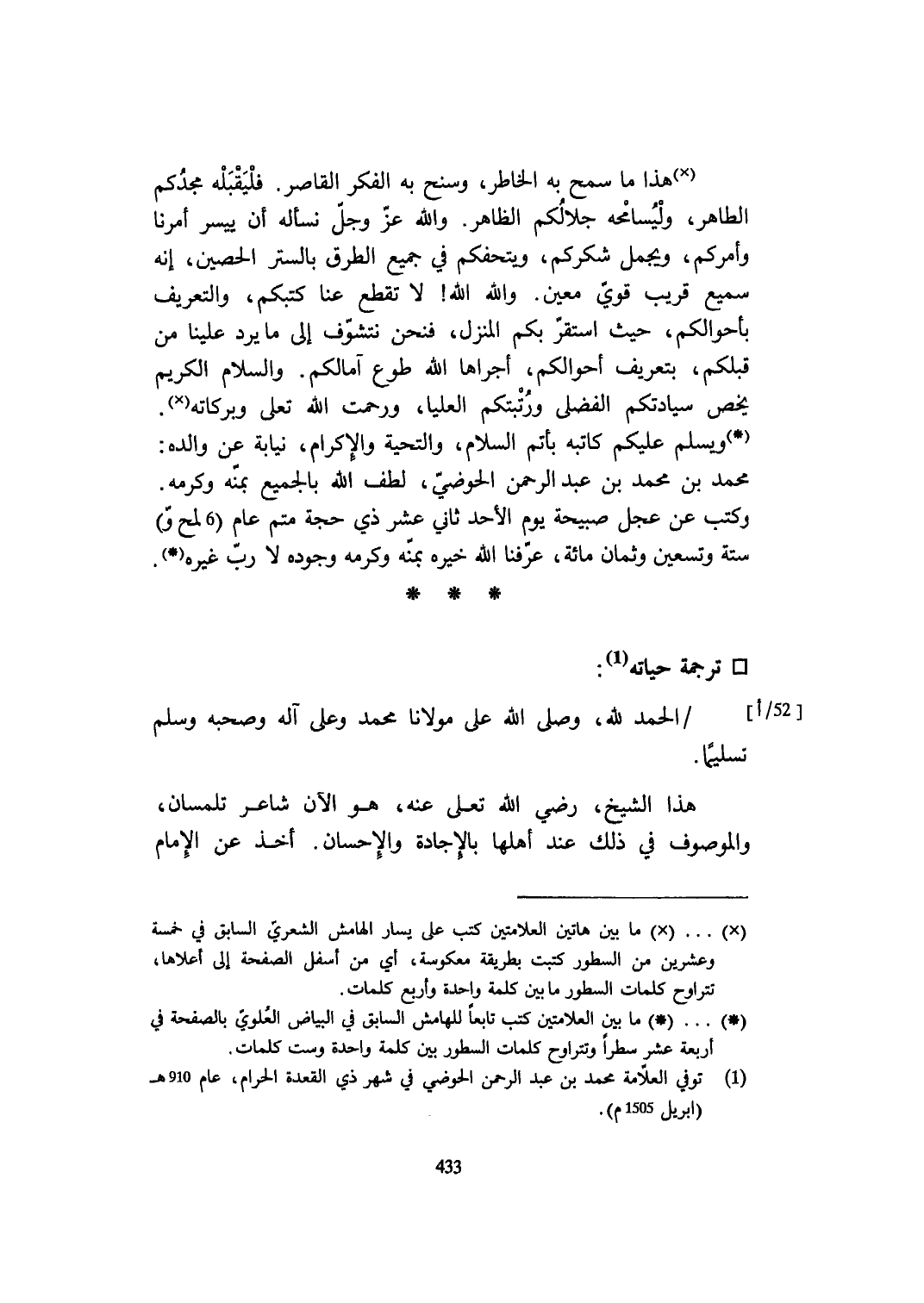 هَذَا مَا سمح بِهِ الخاطر وسنح بِهِ الْفِكر الْقَاصِر فليقبله مجدكم الطَّاهِر وليسامحه جلالكم الظَّاهِر وَالله عز وَجل نَسْأَلهُ أَن ييسر أمرنَا وأمركم ويجمل شكركم ويتحفكم فِي جَمِيع الطّرق بالستر الْحصين إِنَّه سميع قريب قوي معِين وَالله الله لَا تقطع عَنَّا كتبكم والتعريف بأحوالكم حَيْثُ اسْتَقر بكم الْمنزل فَنحْن نتشوف إِلَى مَا يرد علينا من قبلكُمْ بتعريف أحوالكم أجراها الله طوع آمالكم وَالسَّلَام الْكَرِيم يخص سيداتكم الفضلى ورتبتكم الْعليا ورحمت الله تعلى وَبَرَكَاته وَيسلم عَلَيْكُم كَاتبه بأتم السَّلَام والتحية وَالْإِكْرَام نِيَابَة عَن وَالِده مُحَمَّد بن مُحَمَّد بن عبد الرَّحْمَن الحوضي لطف الله بِالْجَمِيعِ بمنه وَكَرمه وَكتب عَن عجل صَبِيحَة يَوْم الْأَحَد ثَانِي عشر ذِي حجَّة متم عَام 6 لمح وَسِتَّة وَتِسْعين وثمان مائَة عرفنَا الله خَيره بمنه وَكَرمه وجوده لَا رب غَيره