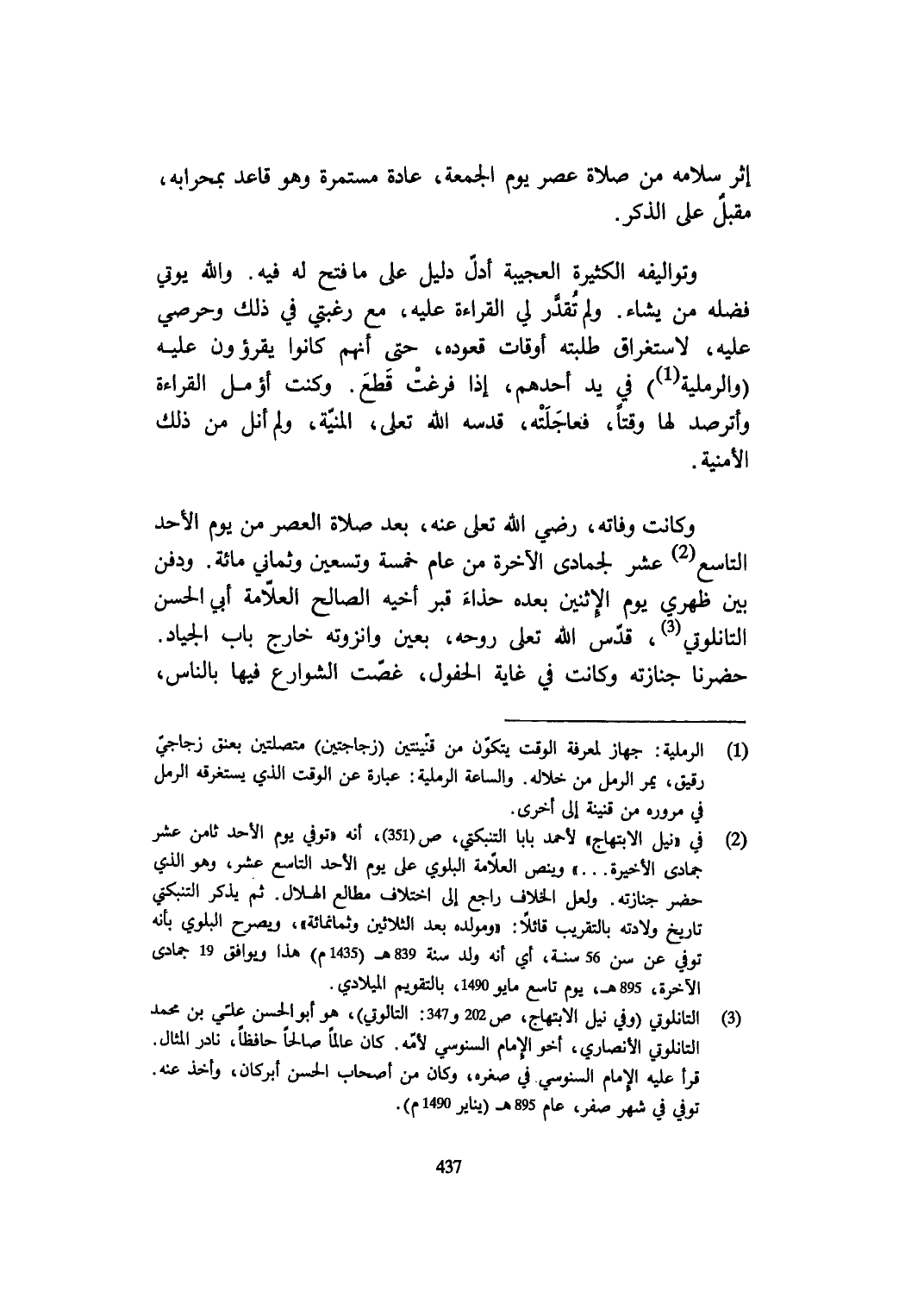 وَكَانَت وَفَاته رَضِي الله تعلى عَنهُ بعد صَلَاة الْعَصْر من يَوْم الْأَحَد التَّاسِع عشر لجمادى الْآخِرَة من عَام خَمْسَة وَتِسْعين وثماني مائَة وَدفن بَين ظَهْري يَوْم الْإِثْنَيْنِ بعده حذاء قبر أَخِيه الصَّالح الْعَلامَة أبي الْحسن التانلوتي قدس الله تعلى روحه بِعَين وانزوته خَارج بَاب الْجِيَاد حَضَرنَا جنَازَته وَكَانَت فِي غَايَة الحفول غصت الشوارع فِيهَا بِالنَّاسِ