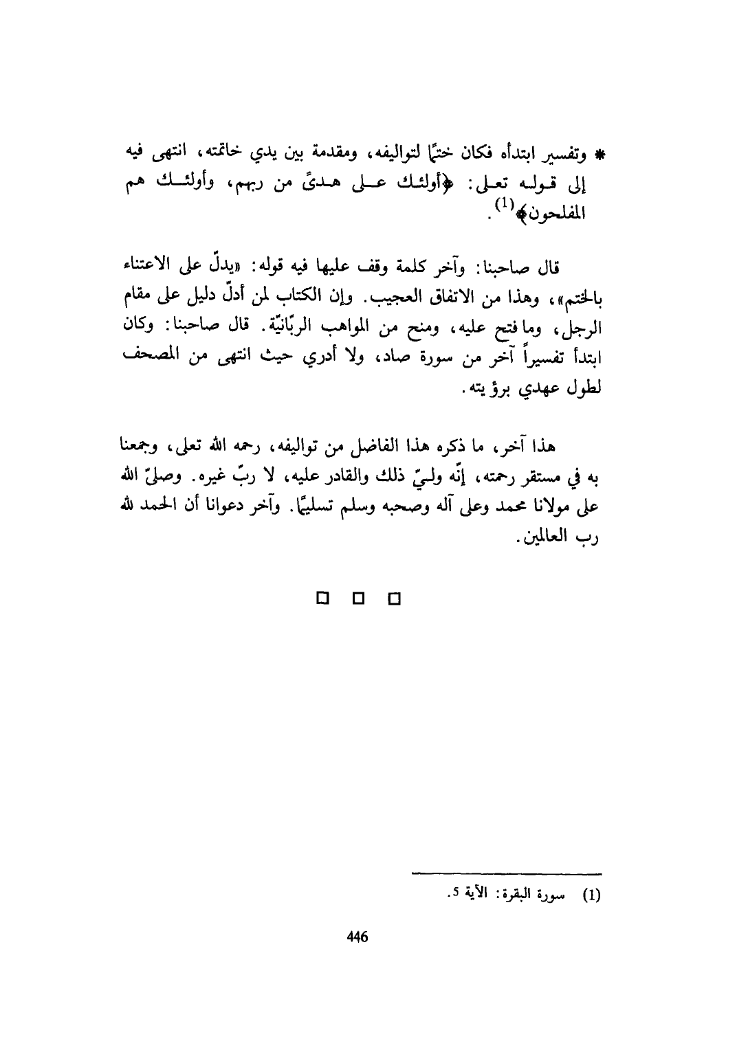وَتَفْسِير ابتدأه فَكَانَ ختما لتواليفه ومقدمة بَين يَدي خاتمته انْتهى فِيهِ إِلَى قَوْله تعلى {أُولَئِكَ على هدى من رَبهم وَأُولَئِكَ هم المفلحون}