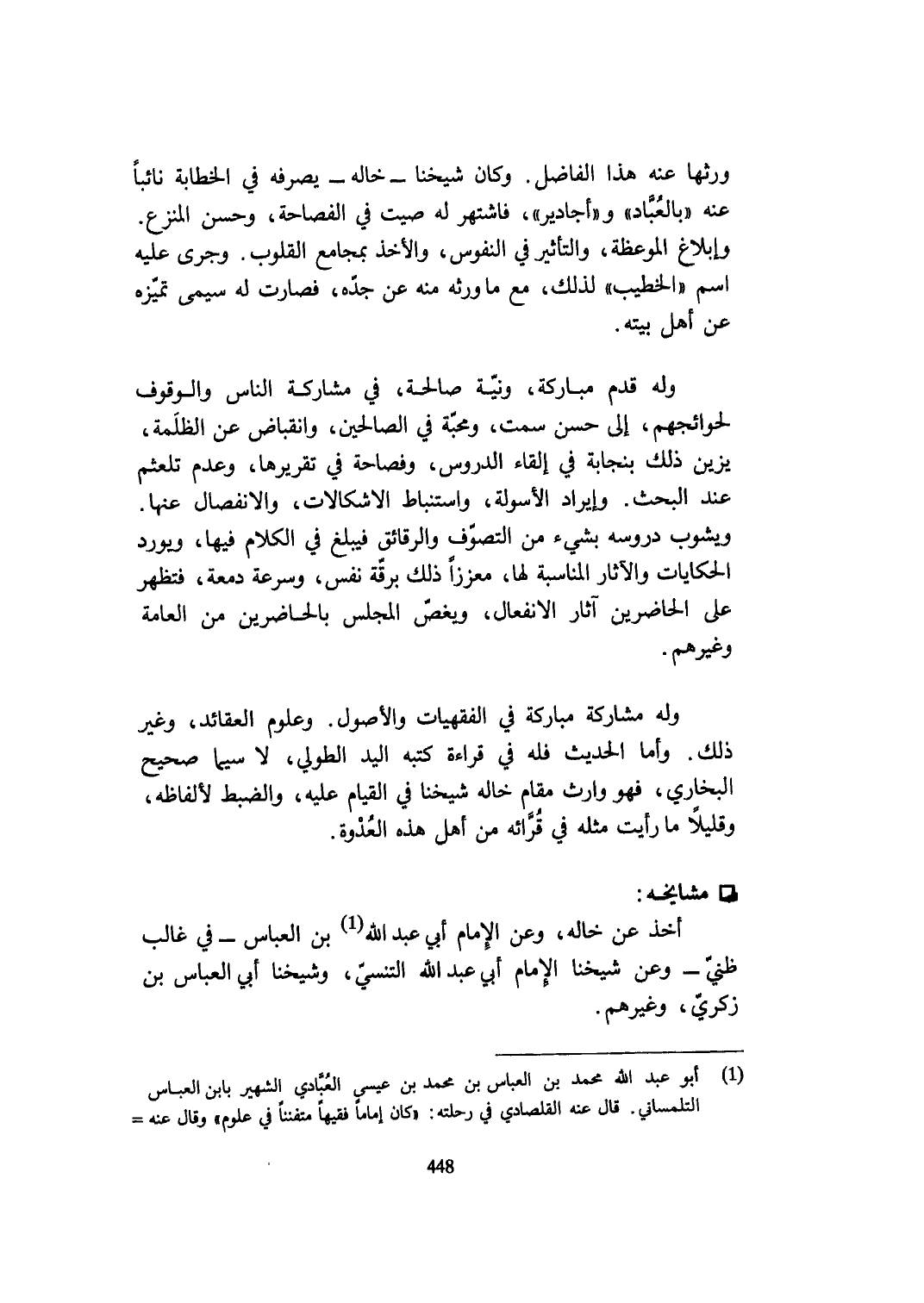 وَله قدم مباركة وَنِيَّة صَالِحَة فِي مُشَاركَة النَّاس وَالْوُقُوف لحوائجهم إِلَى حسن سمت ومحبة فِي الصَّالِحين وانقباض عَن الظلمَة يزين ذَلِك بنجابة فِي إِلْقَاء الدُّرُوس وفصاحة فِي تقريرها وَعدم تلعثم عِنْد الْبَحْث وإيراد الأسولة واستنباط الاشكالات والانفصال عَنْهَا ويشوب دروسه بِشَيْء من التصوف وَالرَّقَائِق فَيبلغ فِي الْكَلَام فِيهَا ويورد الحكايات والْآثَار الْمُنَاسبَة لَهَا معززا ذَلِك برقة نفس وَسُرْعَة دمعة فتظهر على الْحَاضِرين آثَار الانفعال ويغص الْمجْلس بالحاضرين من الْعَامَّة وَغَيرهم
