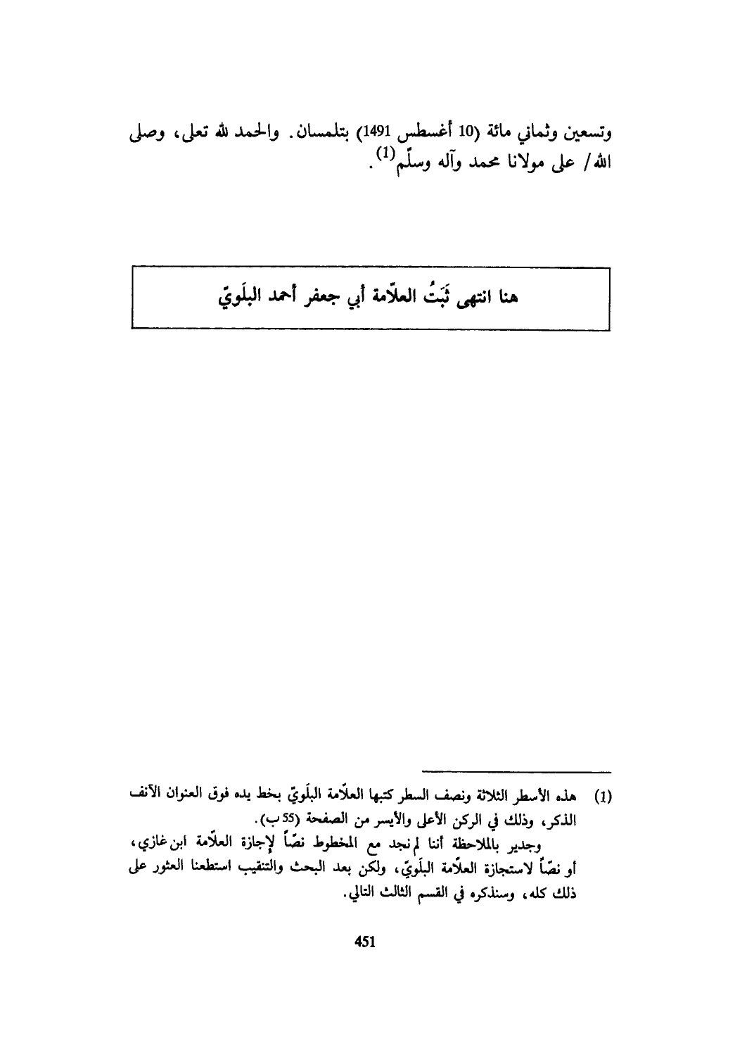 وَتِسْعين وثماني مائَة 10 أغسطس 1491 بتلمسان وَالْحَمْد لله تعلى وَصلى الله على مَوْلَانَا مُحَمَّد وَآله وَسلم