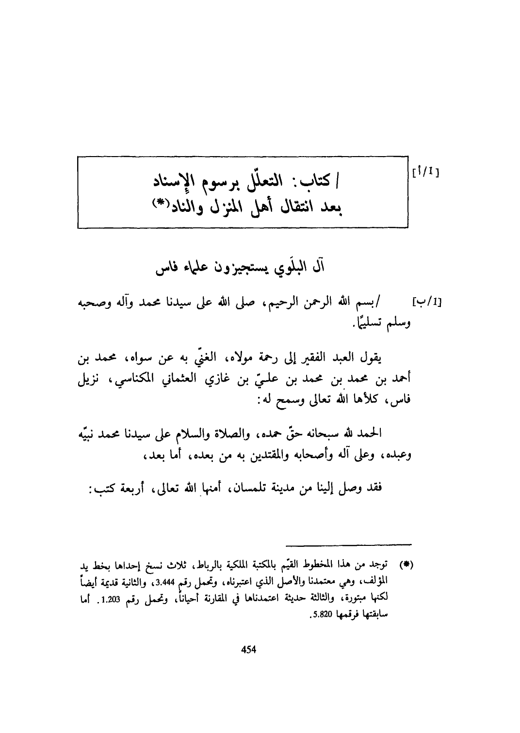 يَقُول العَبْد الْفَقِير إِلَى رَحْمَة مَوْلَاهُ الْغَنِيّ بِهِ عَن سواهُ مُحَمَّد بن أَحْمد بن مُحَمَّد بن مُحَمَّد بن عَليّ بن غَازِي العثماني المكناسي نزيل فاس كلأها الله تَعَالَى وسمح لَهُ