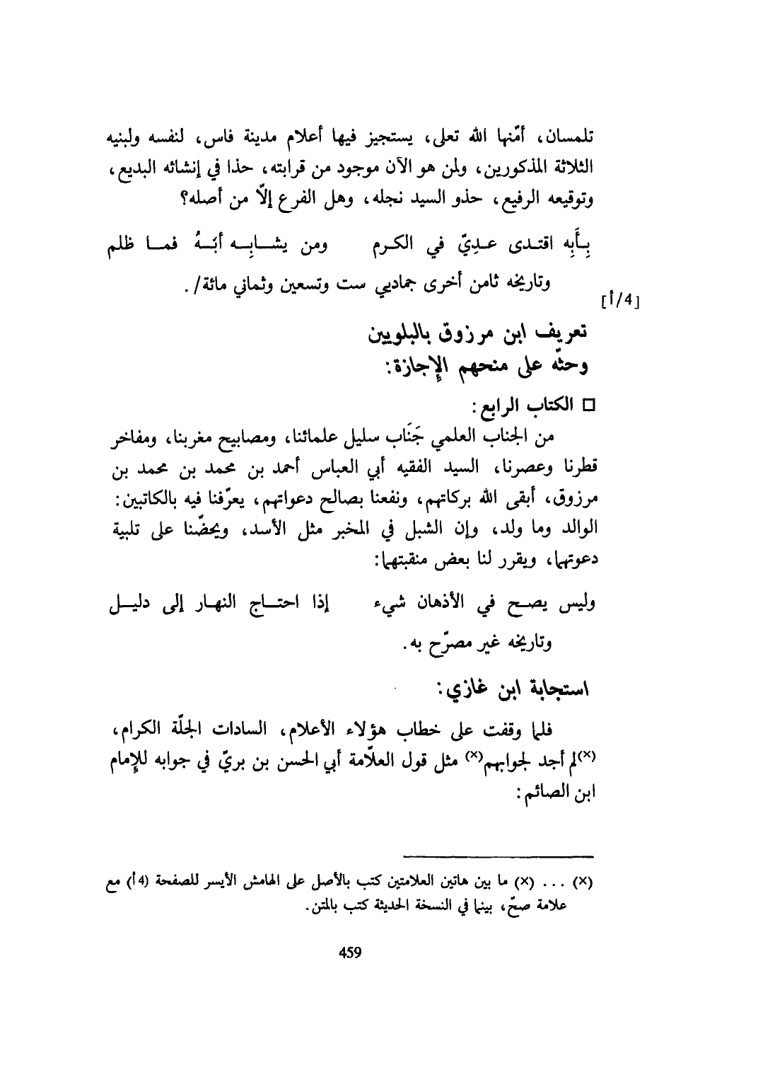 من الْجَانِب العلمي جناب سليل عُلَمَائِنَا ومصابيح مغربنا ومفاخر قطرنا وعصرنا السَّيِّد الْفَقِيه أبي الْعَبَّاس أَحْمد بن مُحَمَّد بن مُحَمَّد بن مَرْزُوق أبقى الله بركاتهم ونفعنا بِصَالح دعواتهم يعرفنا فِيهِ بالكاتبين الْوَالِد وَمَا ولد وَإِن الشبل فِي الْمخبر مثل الْأسد ويحضنا على تَلْبِيَة دعوتهما ويقرر لنا بعض منقبتهما