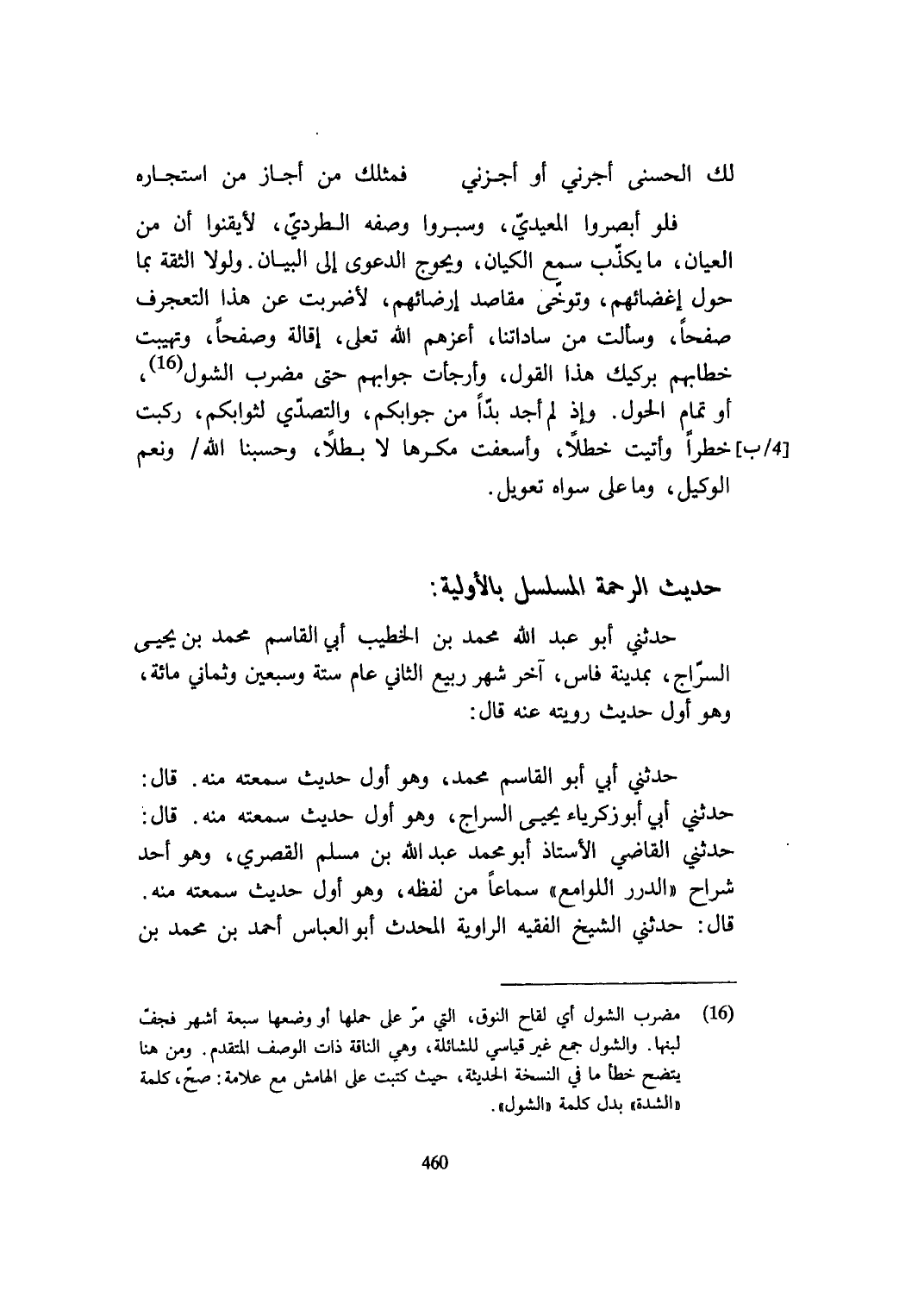 فَلَو أبصروا المعيدي وسبروا وَصفه الطردي لأيقنوا أَن من العيان مَا يكذب سمع الكيان ويحوج الدَّعْوَى إِلَى الْبَيَان وَلَوْلَا الثِّقَة بِمَا حول إغضائهم وتوخى مَقَاصِد إرضائهم لأضربت عَن هَذَا التعجرف صفحا وَسَأَلت من سَادَاتنَا أعزهم الله تعلى إِقَالَة وصفحا وتهيبت خطابهم بركيك هَذَا القَوْل وأرجأت جوابهم حَتَّى مضرب الشول أَو تَمام الْحول وَإِذ لم أجد بدا من جوابكم والتصدي لثوابكم ركبت خطرا وأتيت خطلا وأسعفت مكْرها لَا بطلا وحسبنا الله وَنعم الْوَكِيل وَمَا على سواهُ تعويل