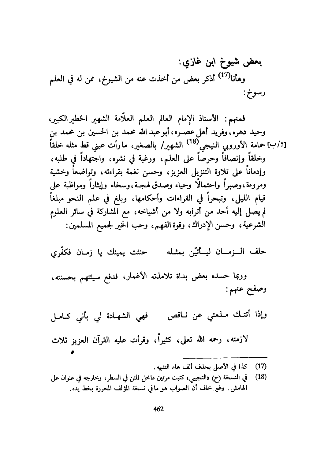 فَمنهمْ الْأُسْتَاذ الإِمَام الْعَالم الْعلم الْعَلامَة الشهير الخطير الْكَبِير وحيد دهره وفريد أهل عصره أَبُو عبد الله مُحَمَّد بن الْحُسَيْن بن مُحَمَّد بن حمامة الأوروبي النيجي الشهير بالصغير مَا رَأَتْ عَيْني قطّ مثله خلقا وخلقا وإنصافا وحرصا على الْعلم ورغبة فِي نشره واجتهاده فِي طلبه وإدمانا على تلاوى التَّنْزِيل الْعَزِيز وَحسن نَغمَة بقرَاءَته وتواضعا وخشية ومروءة وصبرا واحتمالا وحياء وَصدق لهجة وسخاء وإيثارا ومواظبة على قيام اللَّيْل وتبحرا فِي الْقرَاءَات وأحكامها وَبلغ فِي علم النَّحْو مبلغا لم يصل إِلَيْهِ أحد من أترابه وَلَا من أشياخه مَعَ الْمُشَاركَة فِي سَائِر الْعُلُوم الشَّرْعِيَّة وَحسن الْإِدْرَاك وَقُوَّة الْفَهم وَحب الْخَيْر لجَمِيع الْمُسلمين