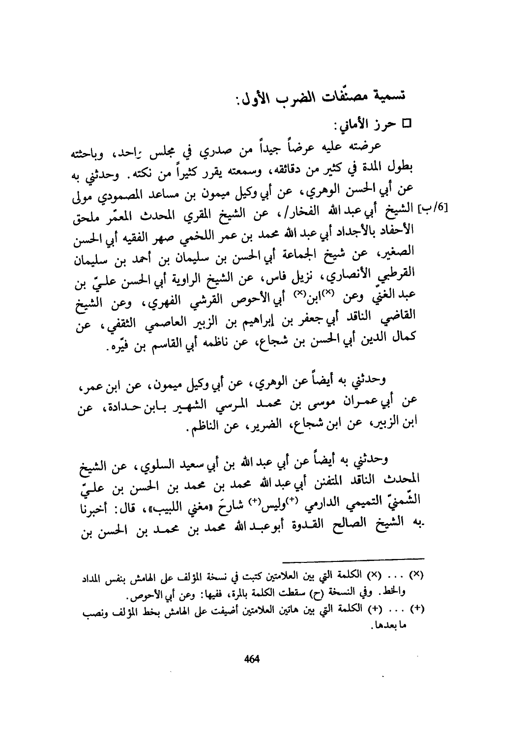 وحَدثني بِهِ أَيْضا عَن أبي عبد الله بن أبي سعيد السلوي عَن الشَّيْخ الْمُحدث النَّاقِد المتفنن أبي عبد الله مُحَمَّد بن مُحَمَّد بن الْحسن بن عَليّ الشمني التَّمِيمِي الدَّارمِيّ وَلَيْسَ شَارِح مُغنِي اللبيب قَالَ أخبرنَا بِهِ الشَّيْخ الصَّالح الْقدْوَة أَبُو عبد الله مُحَمَّد بن مُحَمَّد بن الْحسن بن