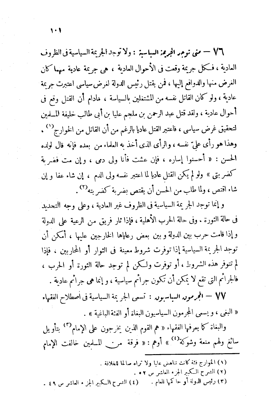 77 - المجرمون السياسيون: تسمى الجريمة السياسية في اصطلاح الفقهاء "البغي"، ويسمى المجرمون السياسيون "البغاة" أو "الفئة الباغية".