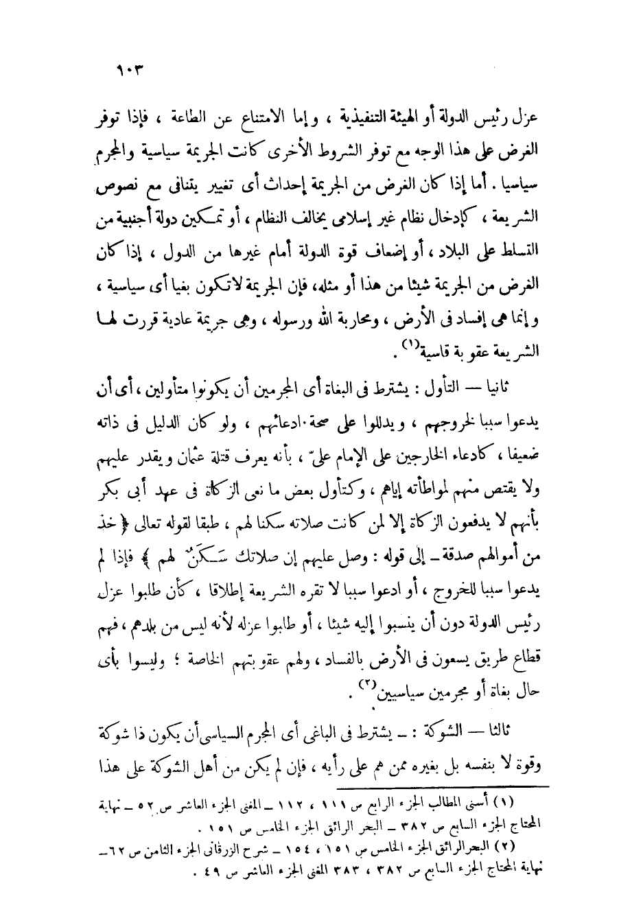 ثانياً: التأول: يشترط في البغاة - أي المجرمين - أن يكونوا متأولين، أي أن يدعوا سبباً لخروجهم، ويدللوا على صحة ادعائهم، ولو كان الدليل في ذاته ضعيفاً، كادعاء الخارجين على الإمام عليّ بأنه يعرف قتلة عثمان ويقدر عليهم ولا يقتص منهم لمواطأته إياهم، وكتأول بعض مانعي الزكاة في عهد أبي بكر بأنهم لا يدفعون الزكاة إلا لمن كانت صلاته سكناً لهم، طبقاً لقوله تعالى: {خُذْ مِنْ أَمْوَالِهِمْ صَدَقَةً} إلى قوله: {وَصَلِّ عَلَيْهِمْ إِنَّ صَلاَتَكَ سَكَنٌ لَّهُمْ} [التوبة: 103] ، فإذا لم يدعوا سبباً للخروج، أو ادعوا سبباً لا تقره الشريعة إطلاقاً، كأن طلبوا عزل رئيس الدولة دون أن ينسبوا إليه شيئاً، أو طلبوا عزله لأنه ليس من بلدهم، فهم قطاع طريق يسعون في الأرض بالفساد، ولهم عقوبتهم الخاصة، وليسوا بأي حال بغاة أو مجرمين سياسيين (¬2) .