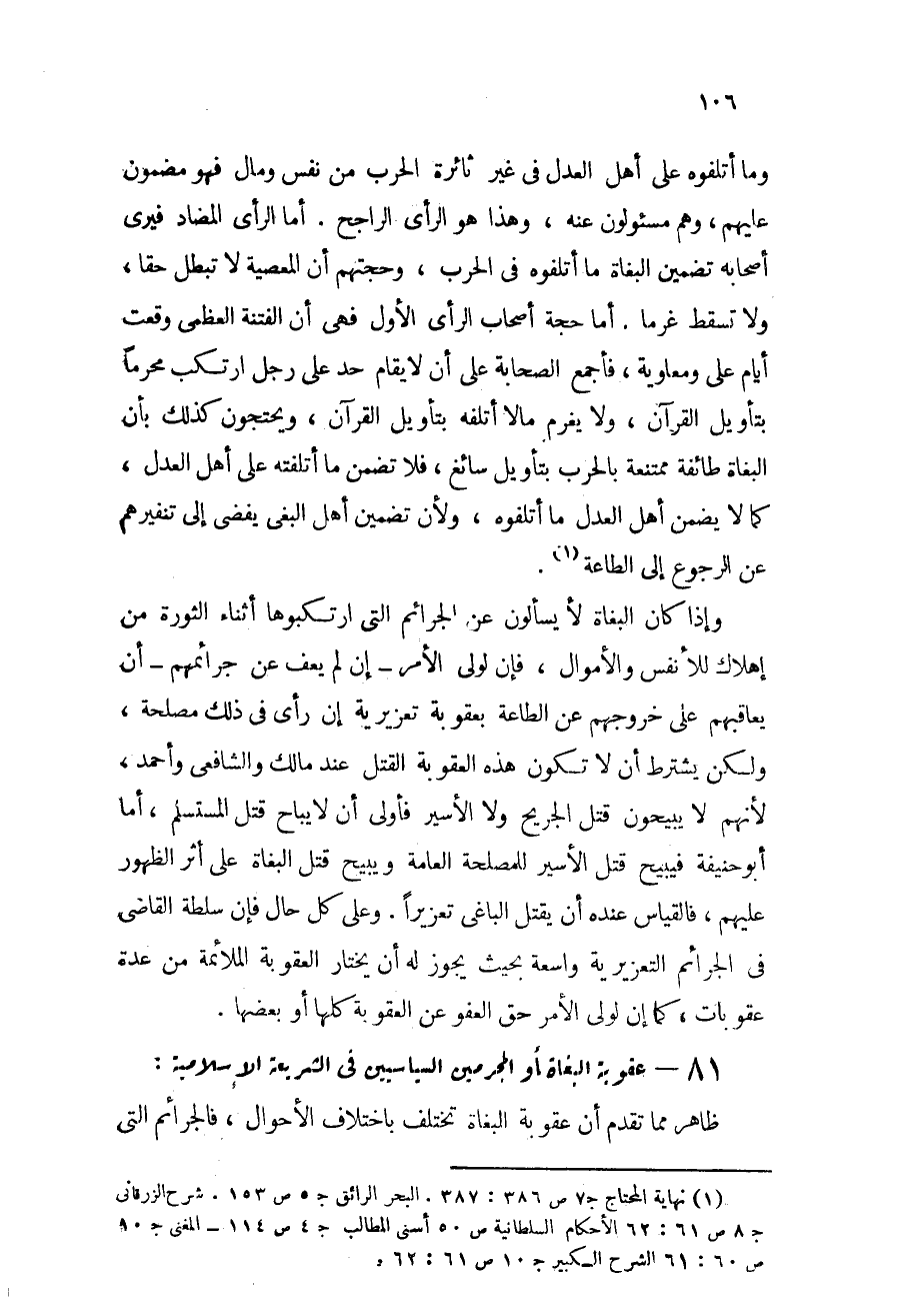 81 - عقوبة البغاة أو المجرمين السياسيين في الشريعة الإسلامية: ظاهر مما تقدم أن عقوبة البغاة تختلف باختلاف الأحوال، فالجرائم التي