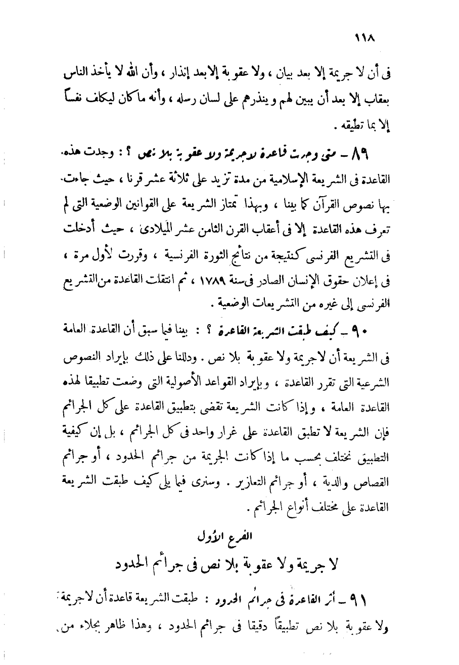 89 - متى وجدت قاعدة "لا جريمة ولا عقوبة بلا نص"؟: وجدت هذه القاعدة في الشريعة الإسلامية من مدة تزيد على ثلاثة عشر قرناً، حيث جاءت بها نصوص القرآن كما بينا، وبهذا تمتاز الشريعة على القوانين الوضعية التي لم تعرف هذه القاعدة إلا في أعقاب القرن الثامن عشر الميلادي، حيث أدخلت في التشريع الفرنسي كنتيجة من نتائج الثورة الفرنسية، وقررت لأول مرة في إعلان حقوق الإنسان الصادر في سنة 1789، ثم انتقلت القاعدة من التشريع الفرنسي إلى غيره من التشريعات الوضعية.