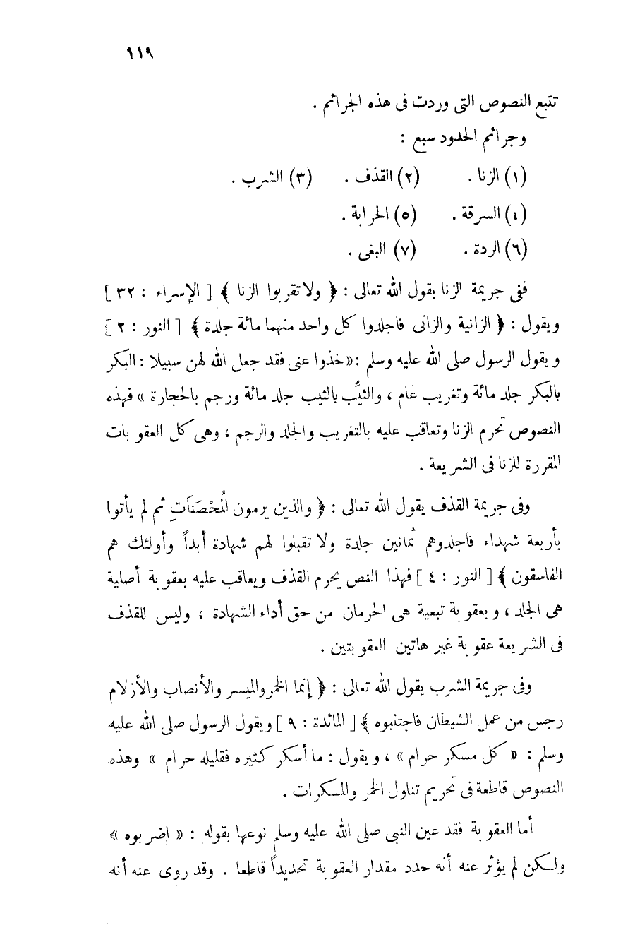(1) الزنا (2) القذف (3) الشرب (4) السرقة (5) الحرابة (6) الردة (7) البغي.