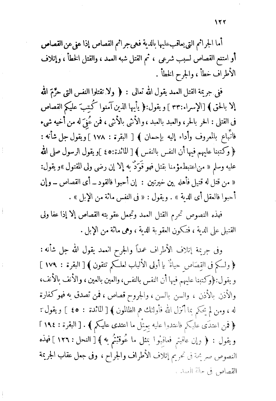 ففي جريمة القتل العمد يقول الله تعالى: {وَلاَ تَقْتُلُواْ النَّفْسَ الَّتِي حَرَّمَ اللهُ إِلاَّ بِالحَقِّ} [الإسراء: 33] ، ويقول: {يَا أَيُّهَا الَّذِينَ آمَنُواْ كُتِبَ عَلَيْكُمُ الْقِصَاصُ فِي الْقَتْلَى الْحُرُّ بِالْحُرِّ وَالْعَبْدُ بِالْعَبْدِ وَالأُنثَى بِالأُنثَى فَمَنْ عُفِيَ لَهُ مِنْ أَخِيهِ شَيْءٌ فَاتِّبَاعٌ بِالْمَعْرُوفِ وَأَدَاء إِلَيْهِ بِإِحْسَانٍ} [البقرة: 178] ، ويقول جل شأنه: {وَكَتَبْنَا عَلَيْهِمْ فِيهَا أَنَّ النَّفْسَ بِالنَّفْسِ} [المائدة: 45] ، ويقول الرسول - صلى الله عليه وسلم -: "من اعتبط مؤمناً بقتل فهو قود به إلا إن رضى ولى المقتول"، ويقول: "من قتل له قتيل فأهله بين خيرتين: إن أحبوا فالقود - أي القصاص - وإن أحبوا فالعقل - أي الدية"، ويقول: "في النفس مائة من الإبل".