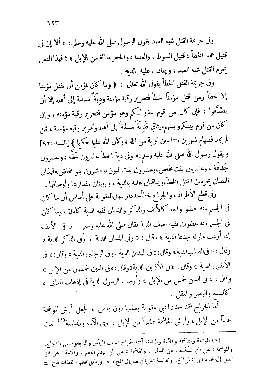 أما الجراح فقد حدد النبي عقوبة بعضها دون بعض، فجعل أرش الموضحة خمساً من الإبل، وأرش الهاشمة عشراً من الإبل، وفي الأمة والدامغة (¬1) ثلث