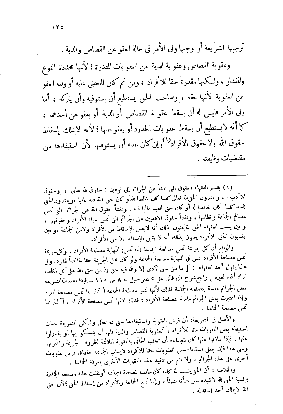 ... والواقع أن كل جريمة تمس مصلحة الجماعة إنما تمس في النهاية مصلحة الأفراد، وكل جريمة تمس مصلحة الأفراد تمس في النهاية مصلحة الجماعة ولو كان محل الجريمة حقاً خالصاً للفرد. وفي هذا يقول أحد الفقهاء: "ما من حق لآدمي إلا ولله فيه حق إذ من حق الله على كل مكلف ترك أذاه لغيره" راجع شرح الزرقاني على مختصر خليل ج8 ص115، فإذا اعتبرت الشريعة بعض الجرائم ماسة بمصلحة الجماعة؛ فذلك لأنها تمس مصلحة الجماعة أكثر مما تمس مصلحة الفرد، وإذا اعتبرت بعض الجرائم ماسة بمصلحة الأفراد؛ فذلك لأنها تمس مصلحة الأفراد أكثر مما تمس= =مصلحة الجماعة. والأصل في الشريعة: أن فرض العقوبة واستيفاءها حق لله تعالى، ولكن الشريعة جعلت استيفاء بعض العقوبات حقاً للأفراد، كعقوبة القصاص والدية؛ فلهم أن يتمسكوا بها أو يتنازلوا عنها. فإذا تنازلوا عنها كان للجماعة أن تعاقب الجاني بالعقوبة الملائمة لظروف الجريمة والمجرم. وعلى هذا فإن جعل استيفاء بعض العقوبات حقاً للأفراد لا يسلب الجماعة حقها في فرض عقوبات أخرى على هذه الجرائم، ولا يمنع من تنفيذ هذه العقوبات الأخرى بمعرفة الجماعة.