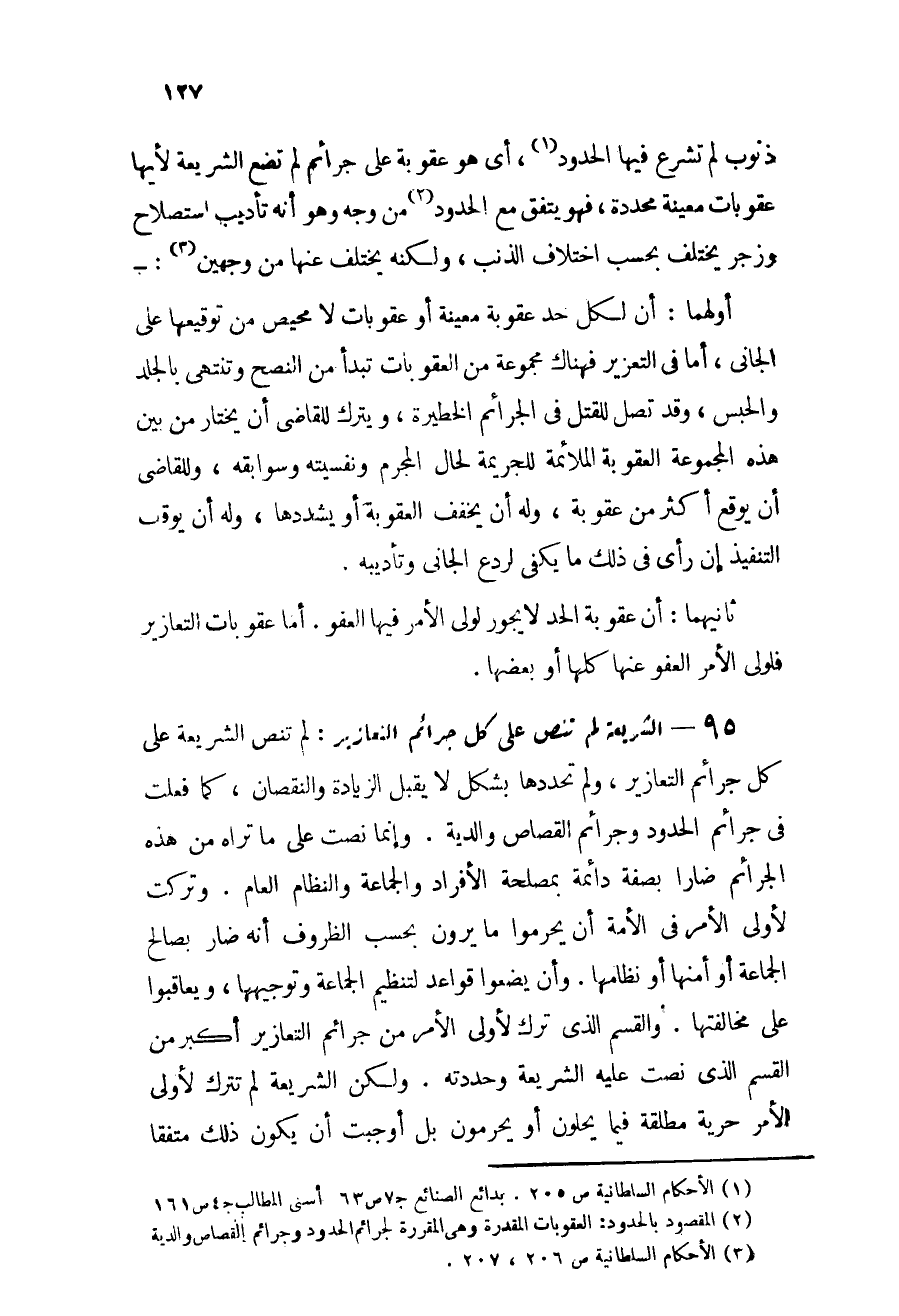 95 - الشريعة لم تنص على كل جرائم التعازير: لم تنص الشريعة على كل جرائم التعازير، ولم تحددها بشكل لا يقبل الزيادة والنقصان، كما فعلت في جرائم الحدود وجرائم القصاص والدية، وإنما نصت على ما تراه من هذه الجرائم ضاراً بصفة دائمة بمصلحة الأفراد والجماعة والنظام العام، وتركت لأولي الأمر في الأمة أن يحرموا ما يرون بحسب الظروف أنه ضار بصالح الجماعة أو أمنها أو نظامها، وأن يضعوا قواعد لتنظيم الجماعة وتوجيهها، ويعاقبوا على مخالفتها. والقسم الذي ترك لأولي الأمر من جرائم التعازير أكبر من القسم الذي نصت عليه الشريعة وحددته، ولكن الشريعة لم تترك لأولي الأمر حرية مطلقة فيما يحلون أو يحرمون بل أوجبت أن يكون ذلك متفقاً