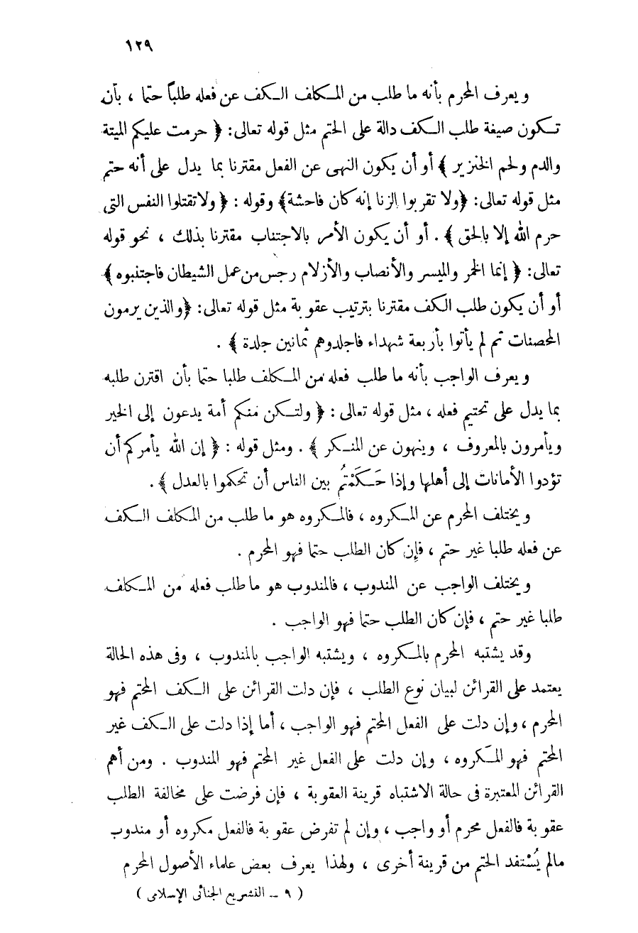 ويعرف المحرم: بأنه ما طلب من المكلف الكف عن فعله طلباً حتماً، بأن تكون صيغة طلب الكف دالة على الحتم، مثل قوله تعالى: {حُرِّمَتْ عَلَيْكُمُ الْمَيْتَةُ وَالْدَّمُ وَلَحْمُ الْخِنْزِيرِ} [المائدة: 3] ، أو أن يكون النهي عن الفعل مقترناً بما يدل على أنه حتم، مثل قوله تعالى: {وَلاَ تَقْرَبُواْ الزِّنَى إِنَّهُ كَانَ فَاحِشَةً} [الإسراء: 32] ، وقوله: {وَلاَ تَقْتُلُواْ النَّفْسَ الَّتِي حَرَّمَ اللهُ إِلاَّ بِالحَقِّ} [الإسراء: 33] ، أو أن يكون الأمر بالاجتناب مقترناً بذلك، نحو قوله تعالى: {إِنَّمَا الْخَمْرُ وَالْمَيْسِرُ وَالأَنصَابُ وَالأَزْلاَمُ رِجْسٌ مِّنْ عَمَلِ الشَّيْطَانِ فَاجْتَنِبُوهُ} [المائدة: 90] ، أو أن يكون طلب الكف مقترناً بترتيب عقوبة، مثل قوله تعالى: {وَالَّذِينَ يَرْمُونَ الْمُحْصَنَاتِ ثُمَّ لَمْ يَأْتُوا بِأَرْبَعَةِ شُهَدَاء فَاجْلِدُوهُمْ ثَمَانِينَ جَلْدَةً} [النور: 4] .