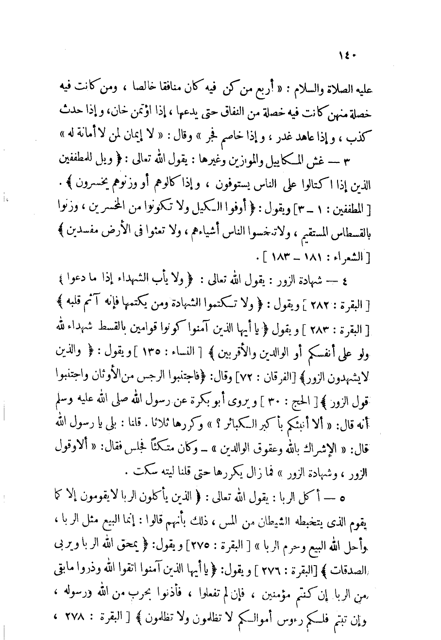 4 - شهادة الزور: يقول الله تعالى: {وَلاَ يَأْبَ الشُّهَدَاء إِذَا مَا دُعُواْ} [البقرة: 282] ، ويقول: {وَلاَ تَكْتُمُواْ الشَّهَادَةَ وَمَن يَكْتُمْهَا فَإِنَّهُ آثِمٌ قَلْبُهُ} [البقرة: 283] ، ويقول: {يَا أَيُّهَا الَّذِينَ آمَنُواْ كُونُواْ قَوَّامِينَ بِالْقِسْطِ شُهَدَاء لِلّهِ وَلَوْ عَلَى أَنفُسِكُمْ أَوِ الْوَالِدَيْنِ وَالأَقْرَبِينَ} [النساء: 135] ، ويقول: {وَالَّذِينَ لا يَشْهَدُونَ الزُّورَ} [الفرقان: 72] وقال: {فَاجْتَنِبُوا الرِّجْسَ مِنَ الأَوْثَانِ وَاجْتَنِبُوا قَوْلَ الزُّورِ} [الحج: 30] ، ويروي أبو بَكْرةَ عن رسول الله - صلى الله عليه وسلم - أنه قال: "ألا أنبئكم بأكبر الكبائر؟ " وكررها ثلاثاً. قلنا: بلى يا رسول الله. قال: "الإشراك بالله وعقوق الوالدين" وكان متكئاً فجلس فقال: "ألاَ وقول الزور، وشهادة الزور" فما زال يكررها حتى قلنا ليته سكت.