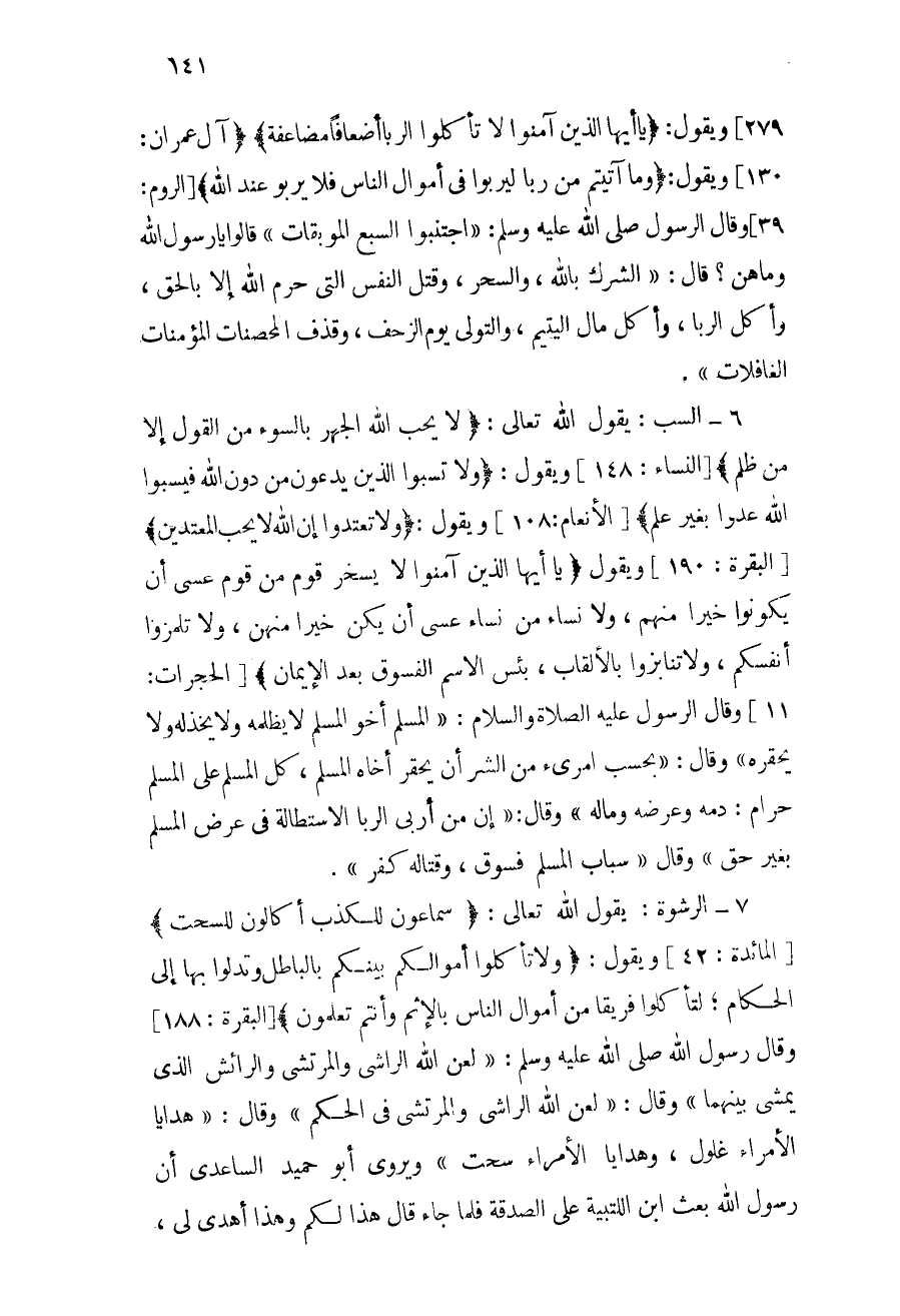 279] ، ويقول: {يَا أَيُّهَا الَّذِينَ آمَنُواْ لاَ تَأْكُلُواْ الرِّبَا أَضْعَافًا مُّضَاعَفَةً} [آل عمران: 130] ، ويقول: {وَمَا آتَيْتُم مِّن رِّبًا لِّيَرْبُوَ فِي أَمْوَالِ النَّاسِ فَلا يَرْبُو عِندَ اللَّهِ} [الروم: 39] ، وقال الرسول - صلى الله عليه وسلم -: "اجتنبوا السبع الموبقات". قالوا: يا رسول الله وما هن؟ قال: "الشرك بالله، والسحر، وقتل النفس التي حرم الله إلا بالحق، وأكل الربا، وأكل مال اليتيم، والتولي يوم الزحف، وقذف المحصنات المؤمنات الغافلات".