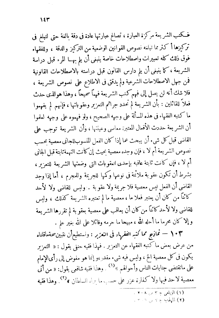 فكتب الشريعة مركزة العبارة، تصاغ عبارتها عادة في دقة بالغة حتى لتبلغ في تركيزها أكثر مما تبلغه نصوص القوانين الوضعية من التركيز والدقة، وللفقهاء فوق ذلك كله تعبيرات واصطلاحات خاصة ينبغي أن يلم بها المرء قبل دراسة الشريعة، كما ينبغي أن يلم دارس القانون قبل دراسته بالاصطلاحات القانونية، فمن جهل الاصطلاحات الشرعية ولم يدقق في الاطلاع على نصوص الشريعة، فلا شك أنه لم يصل إلى فهم كتب الشريعة فهماً صحيحاً، وهذا هو الذي حدث فعلاً للقائمين بأن الشريعة لم تحدد جرائم التعزير وعقوباتها، فإنهم لم يفهموا ما كتبه الفقهاء في هذه المسألة على وجهه الصحيح، ولو فهموه على وجهه لعلموا أن الشريعة حددت الأفعال المعتبرة المعاصي وعينتها، وأن الشريعة توجب على القاضي قبل كل شيء أن يبحث عما إذا كان الفعل المنسوب للجاني معصية بحسب نصوص الشريعة أم لا، فإن وجده معصية بحيث إن كانت التهمة ثابتة قبل الجاني أم لا، فإن كانت ثابتة عاقبه بإحدى العقوبات التي وضعتها الشريعة للتعزير، بشرط أن تكون عقوبة ملائمة في نوعها وكَمها للجريمة وللمجرم، أما إذا وجد القاضي أن الفعل ليس معصية فلا جريمة ولا عقوبة.